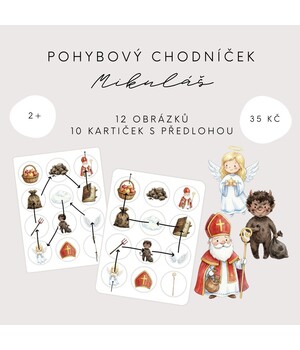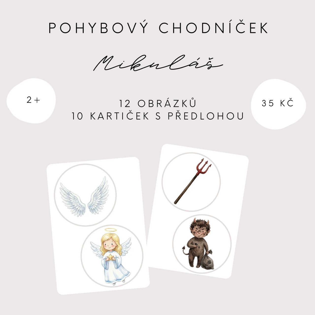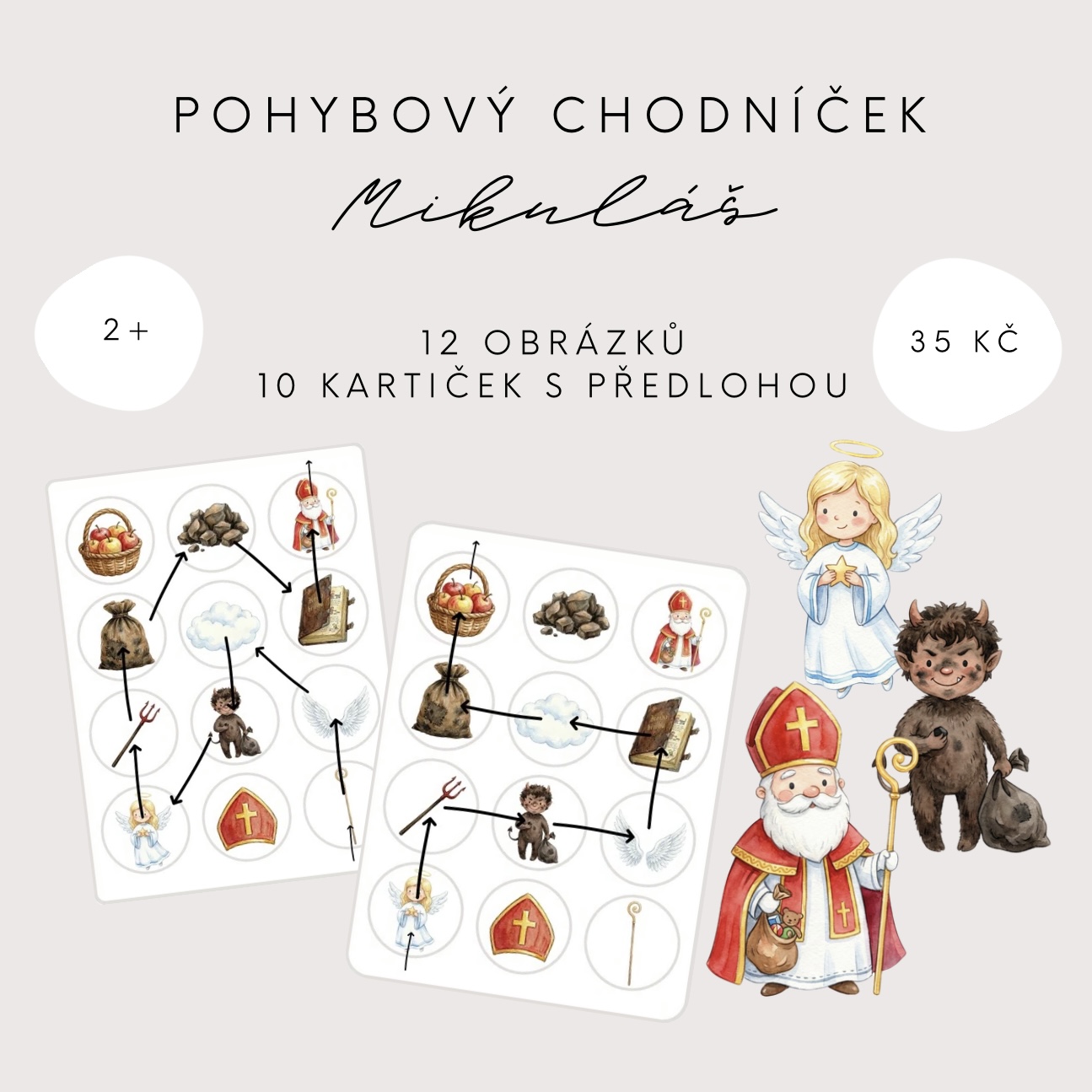 Představujeme Vám náš pohybový chodníček na téma Mikuláš, který je určen především dětem předškolního věku. V tomto souboru najdete 12 koleček s obrázky s tematikou Mikuláše a 10 kartiček s vyznačenou cestičkou.