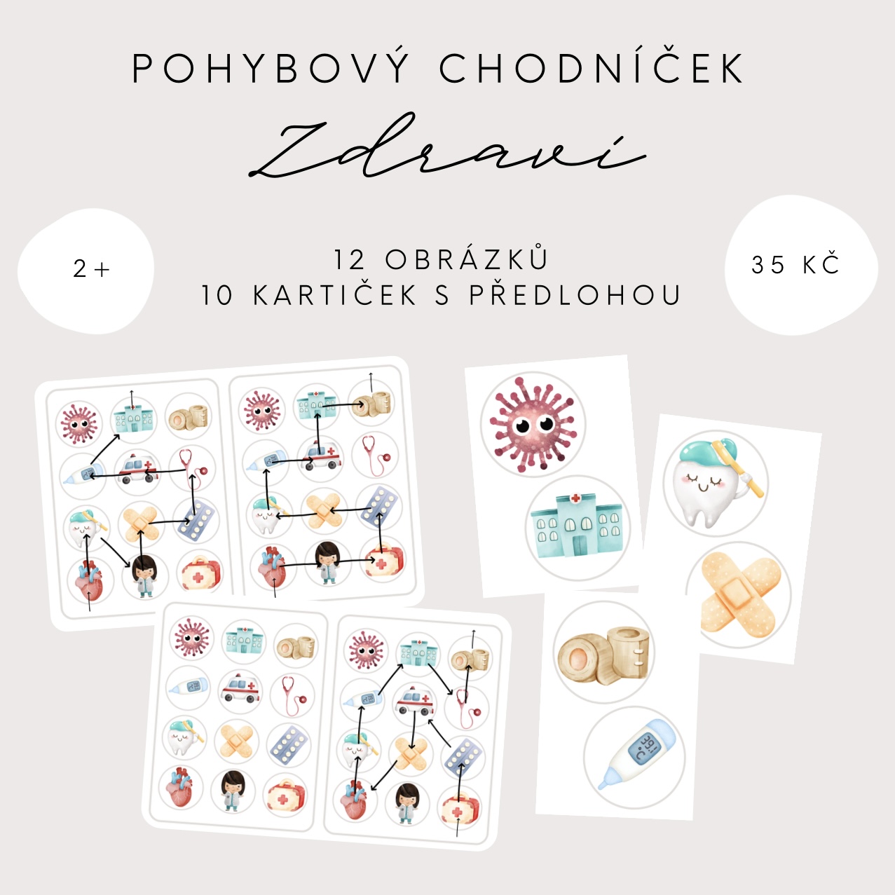 Představujeme Vám náš pohybový chodníček na téma “Zdraví”, který je určen dětem především předškolního věku. V tomto souboru najdete 12 koleček s obrázky s tematikou zdraví a 10 kartiček s vyznačenou cestičkou.