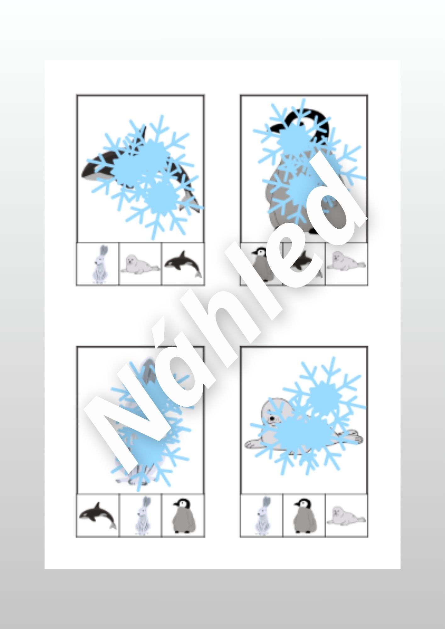 - Prosvítačky polárních zvířátek + zadání, co hledat (str. 9-14) - děti si pomocí baterek prohlížejí ukryté obrázky a hledají správné obrázky podle zadání (vystřihněte vločky a lepidlem spojte dvě tak, aby byl obrázek schovaný)