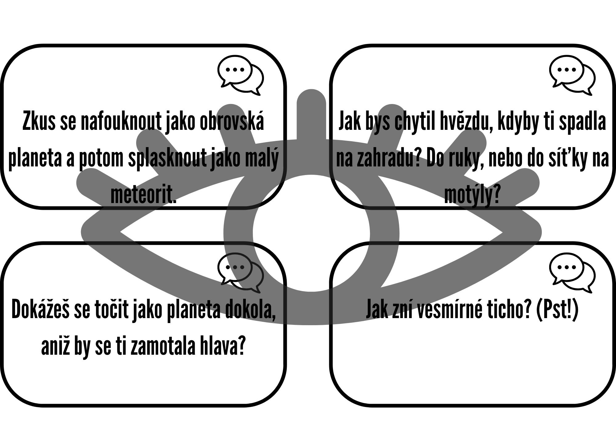 Tento rozsáhlý soubor 72 diskusních a aktivizačních karet je navržen pro pedagogy a rodiče, kteří chtějí hravou formou rozvíjet dětskou fantazii, slovní zásobu a logické myšlení. Tématem je fascinující svět vesmíru, podaný optikou, která je blízká dětskému uvažování.