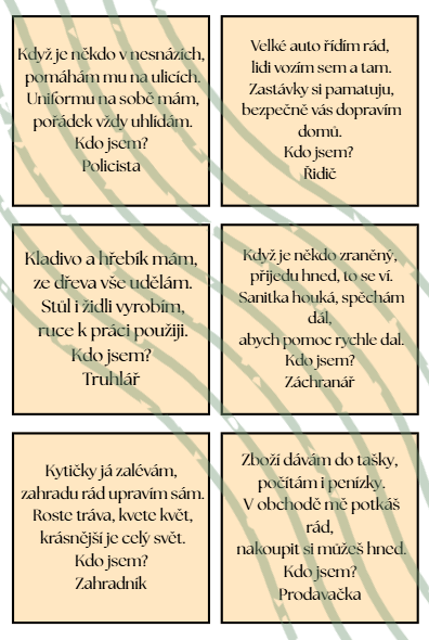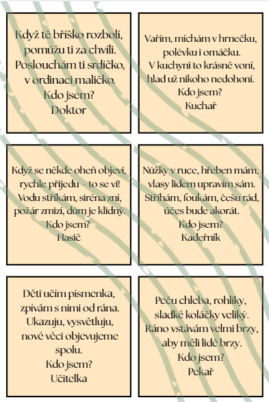 Novinka Kategorie produktu Řemesla a povolání Karty, Hry, Puzzle, Skládačky, atd Demonstrační obrázky /kartičky HÁDANKY, bludiště, labyrinty Prodávající: EliškaJetýlková Cena za ks: 40 Kč s DPH Popis Máte dotaz? Materiál obsahuje 18 kartiček s hádankami a 18 kartiček s obrázky různého povolání. Rýmované hádanky jsou hravé a jednoduché, takže je děti určitě zvládnout uhodnout. You must have JavaScript enabled to use this form. Vaše jméno Váš e-mail Předmět Zpráva Odesláním formuláře souhlasím se zpracováním osobních údajů