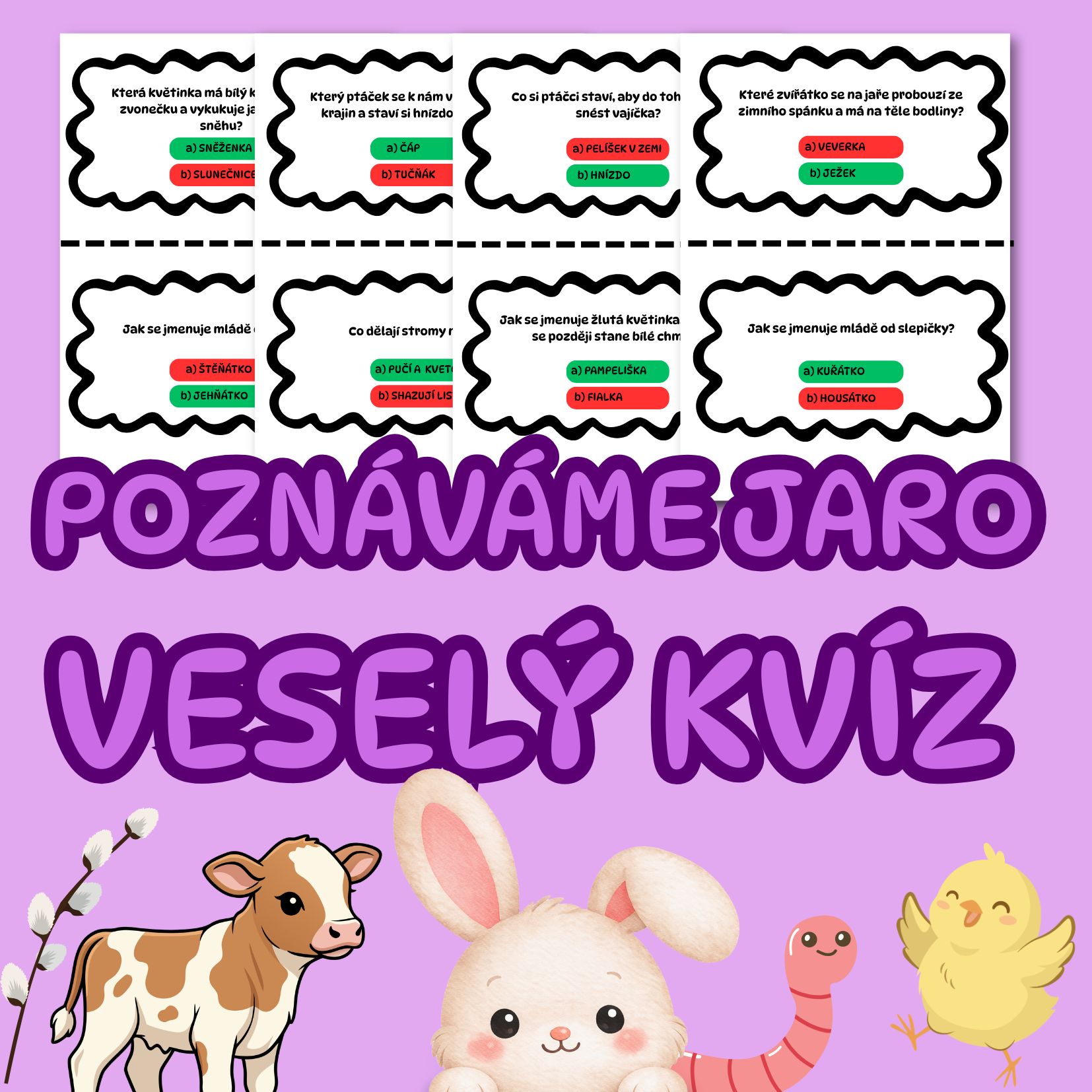 Tento vzdělávací soubor je navržen pro hravé učení a opakování znalostí o jarním období. Obsahuje 30 kvízových karet s originálními otázkami, které pokrývají široké spektrum témat spojených s probouzející se přírodou.