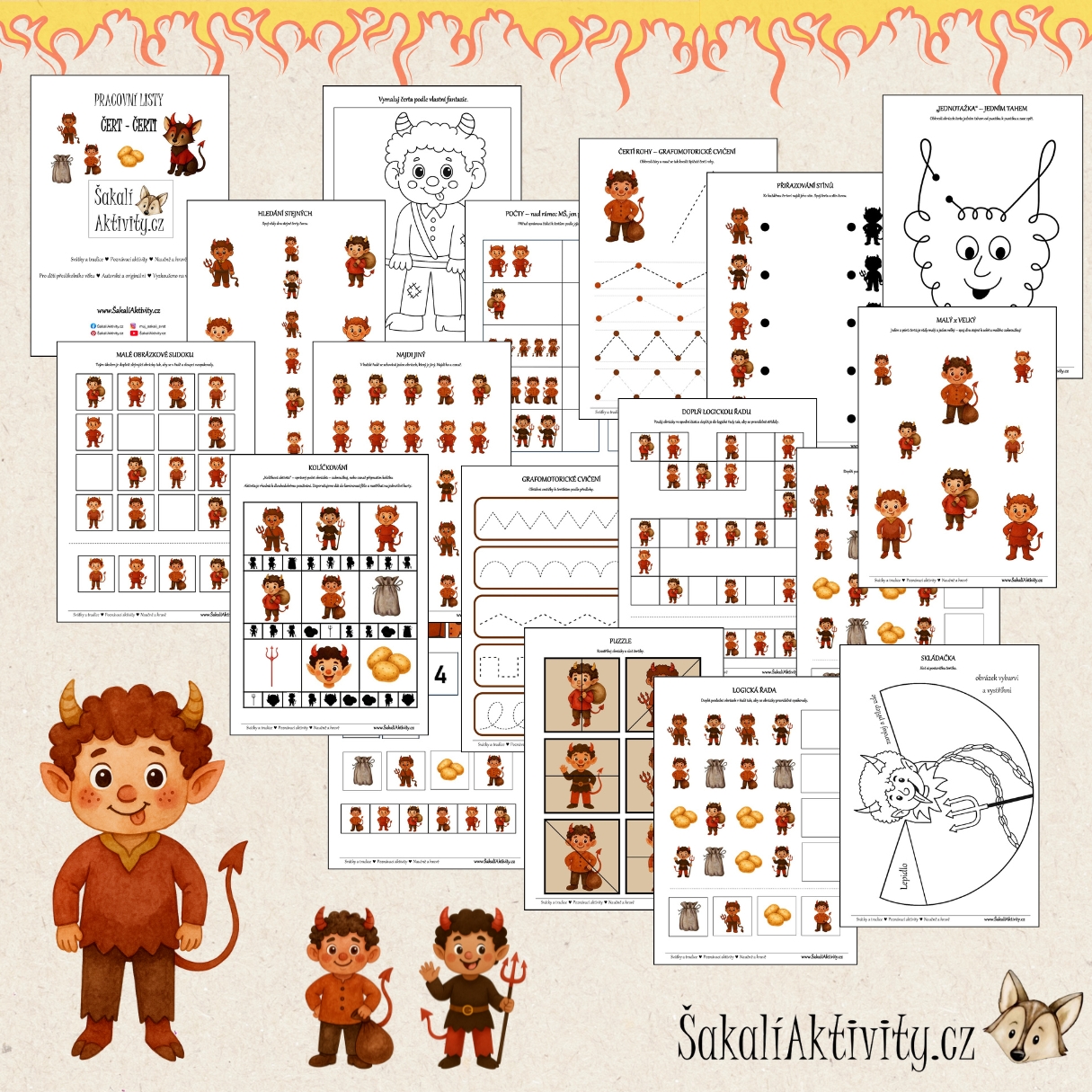 Tento soubor Pracovní listy – Čerti je určen pro předškolní a mladší školní děti (3–6 let) a nabízí 17 stran zábavných a vzdělávacích úkolů s motivy čertů. Každý pracovní list obsahuje název a jednoduchý návod, takže je vhodný pro samostatnou i řízenou práci. Aktivity jsou zaměřeny na rozvoj grafomotoriky, jemné motoriky, zrakového vnímání, logického myšlení a pozornosti.