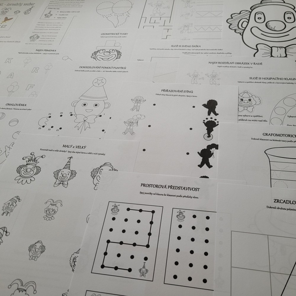 Děti se v souboru setkají s dokreslováním stejných tvarů, bludišti s klauny, grafomotorickými cvičeními zaměřenými na čáry, oblouky, cikcak a vlnky, hledáním stejných a rozdílných obrazců i kolíčkovými aktivitami s počty do 6. Součástí jsou také úkoly na dokreslování tvarů podle předlohy, zrcadlové kreslení do mřížky a seznámení s písmenem K včetně jeho obtahování.