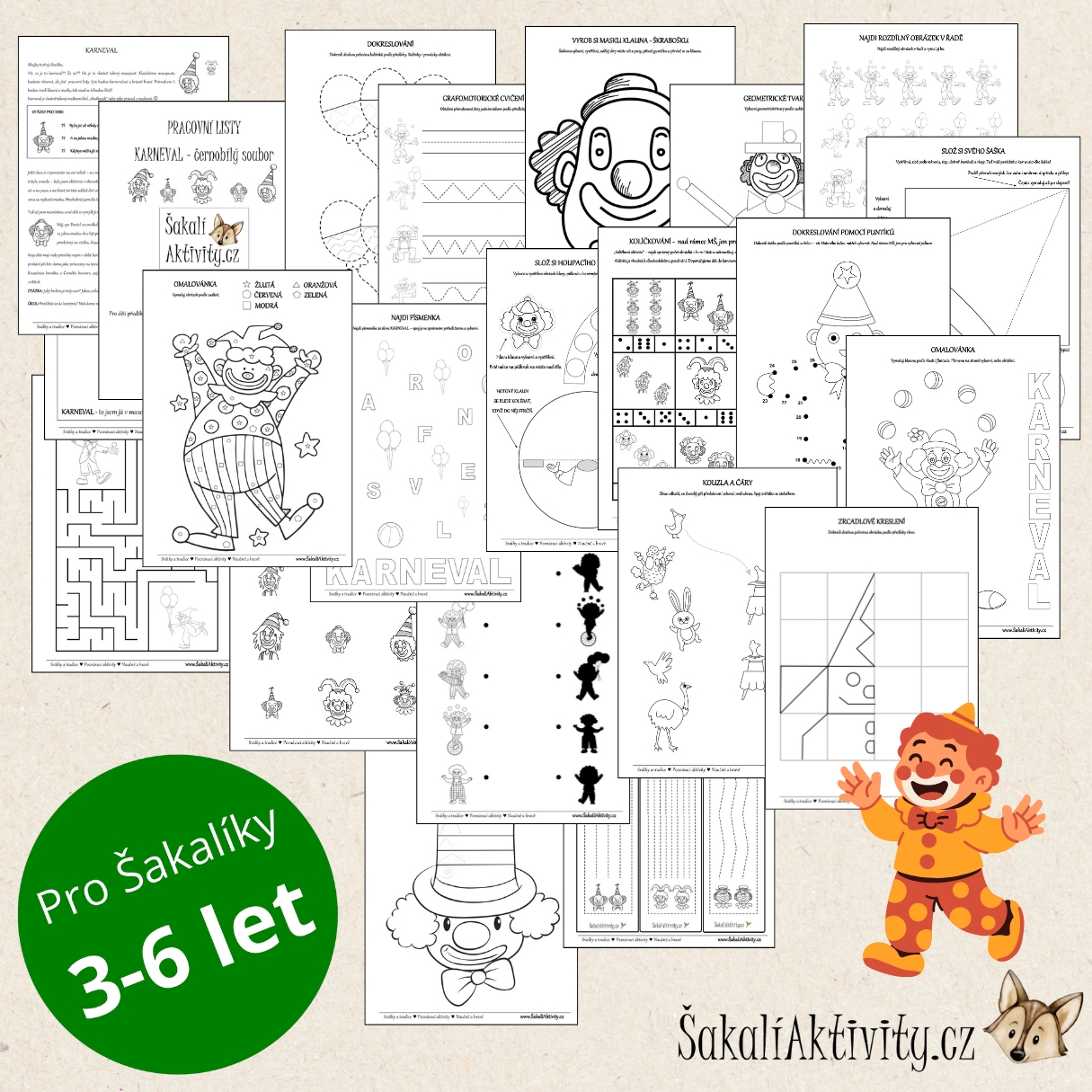 Karneval – pracovní listy (černobílý soubor) je tematicky zaměřený vzdělávací materiál určený pro děti v mateřských školách, školních družinách i při domácím vzdělávání. Soubor obsahuje 24 stran aktivit s tématikou karnevalu a masopustu, kterými děti provází veselí klauni a šašci. Díky černobílému zpracování je materiál ideální jak pro školní tisk, tak pro domácí použití, a zároveň je vhodný k laminaci a opakovanému využívání.