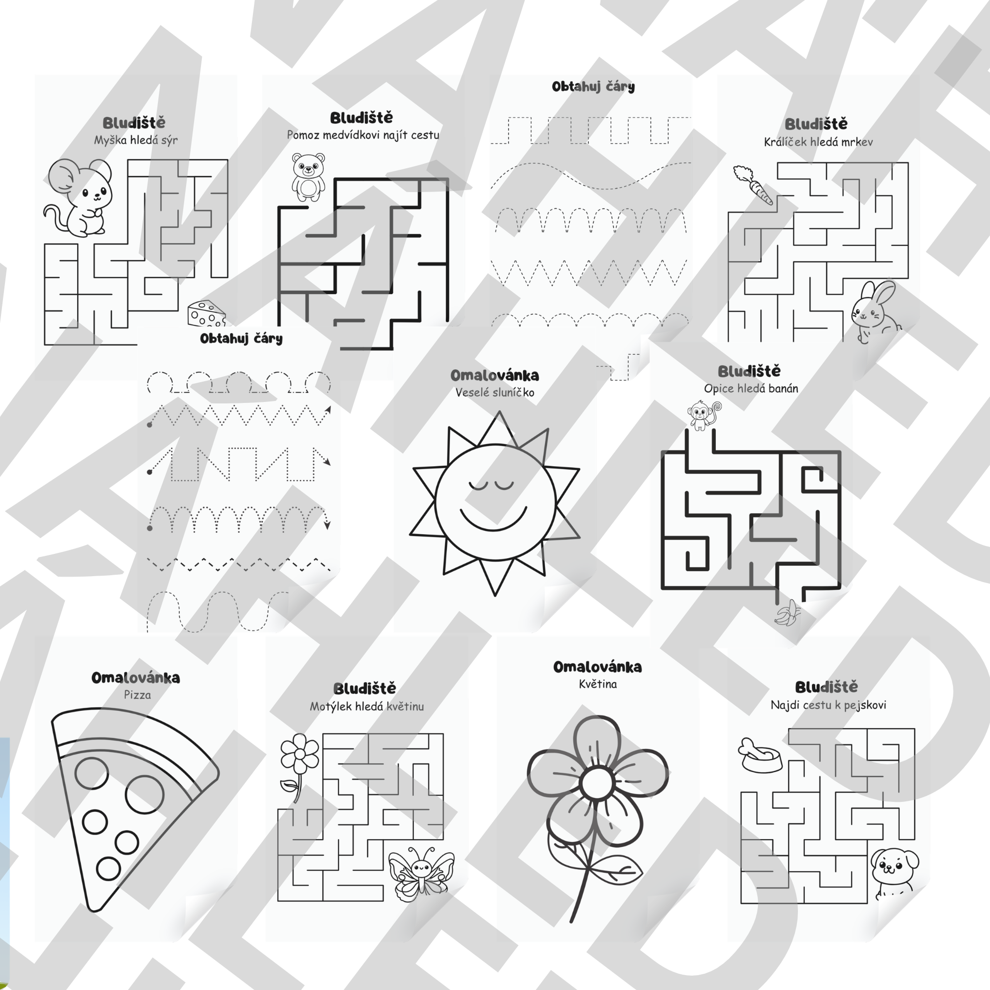 Soubor 13 pracovních listů pro děti ve věku 3–6 let. Materiál obsahuje zábavné aktivity, které pomáhají rozvíjet jemnou motoriku, pozornost a logické myšlení. Děti si procvičí grafomotoriku při obtahování čar, vyřeší jednoduchá bludiště a užijí si také veselé omalovánky.