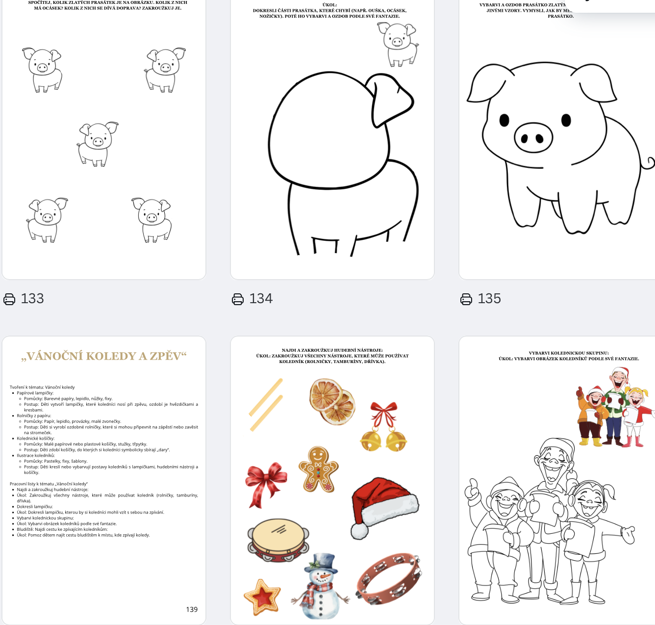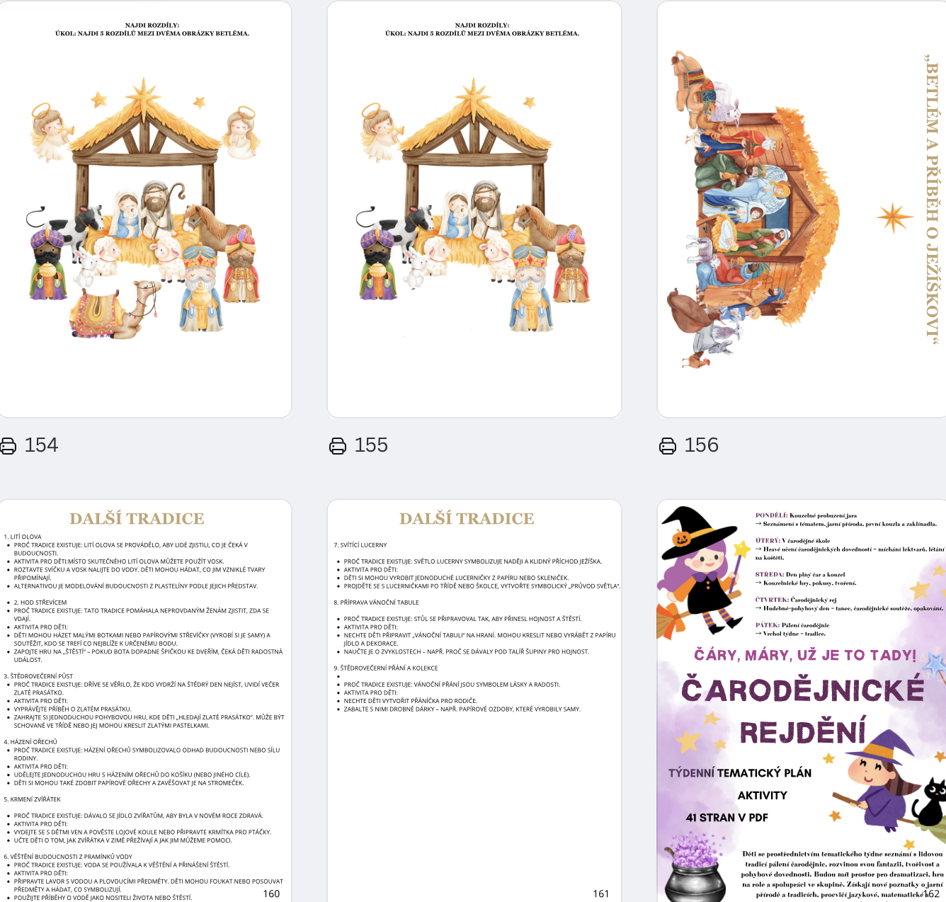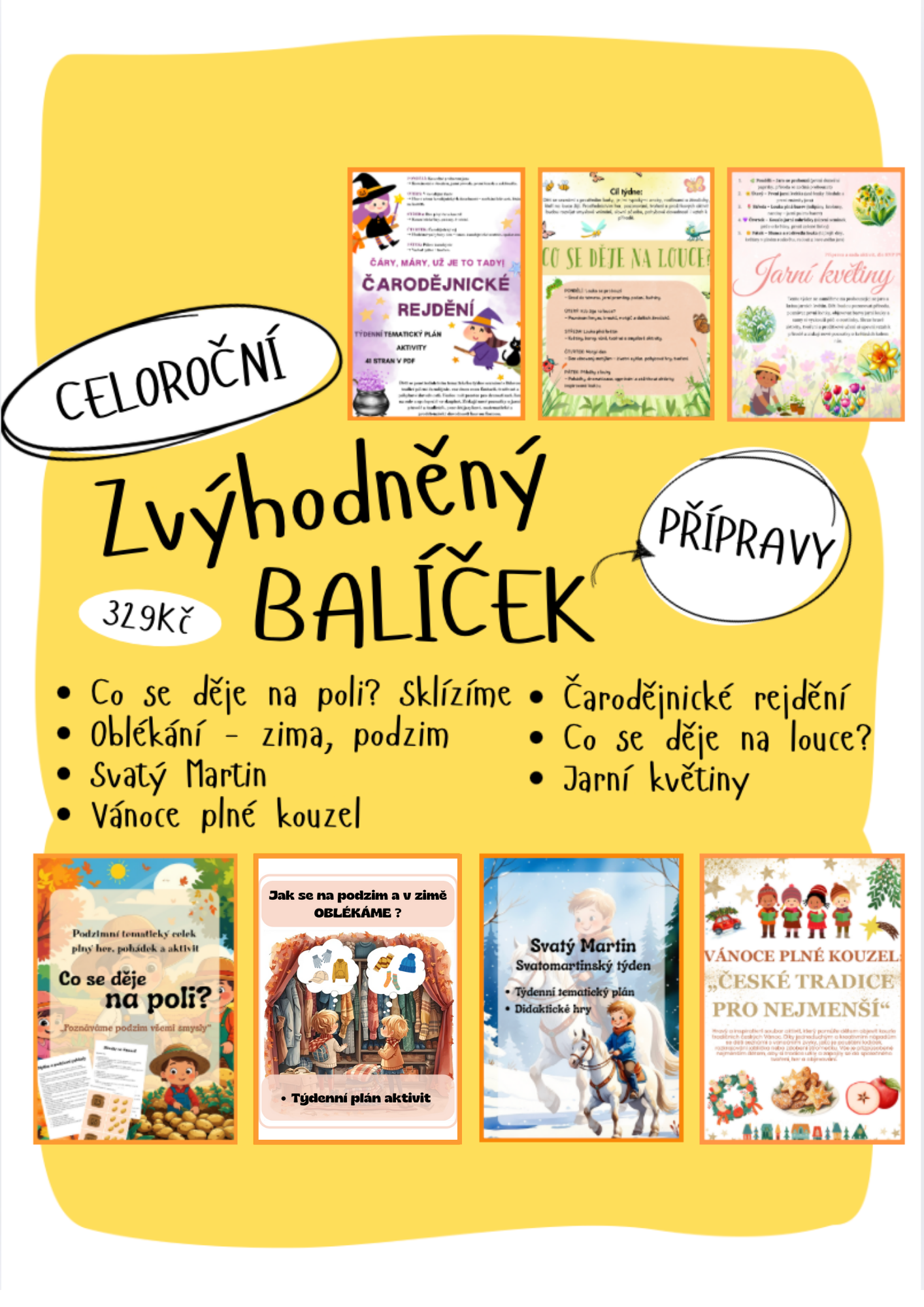 Tento zvýhodněný balíček obsahuje 7 kompletních tematických souborů s přípravami. Materiály jsou koncipované tak, aby Vám usnadnily plánování během celého školního roku – od podzimu až po jaro, od svátků po běžné denní činnosti.