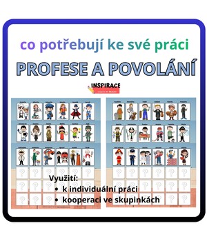 TIP: Možnost laminace pro delší trvanlivost a připevňování dílků na suchý zip (1. část zipu nalepíte do prázdného rámečku u obrázku profese a 2. část suchého zipu na kartičku) , slouží aktivita i k procvičení motoriky.