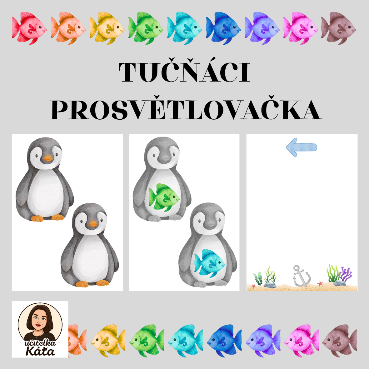 Aktivita je zaměřená na zrakové vnímání a orientaci v prostoru. Úkolem dětí je prosvětlit karty s tučňáky, zjistit, na kterou stranu se dívá ryba (doleva nebo doprava), a podle toho roztřídit karty na papír se správnou šipkou. Děti si procvičují pozornost, rozlišování směrů a logické třídění.