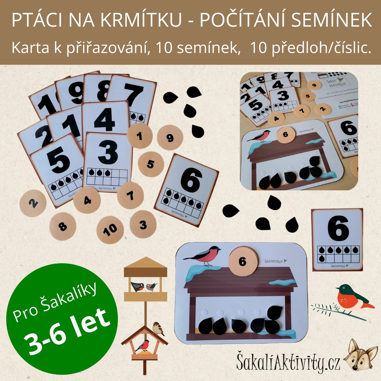 Soubor obsahuje kartu s obrázkem ptačí budky a 10 semínek k vystřižení. Dítě v aktivitě zažívá první početní představivosti, k tomu mu pomáhají předlohové karty s číslicemi 1-10 graficky doplněné semínky a číslice od jedné do deseti. V rámci aktivity dítě přikládá na obrázek krmítka číslici a semínka podle zadání na kartičkách.