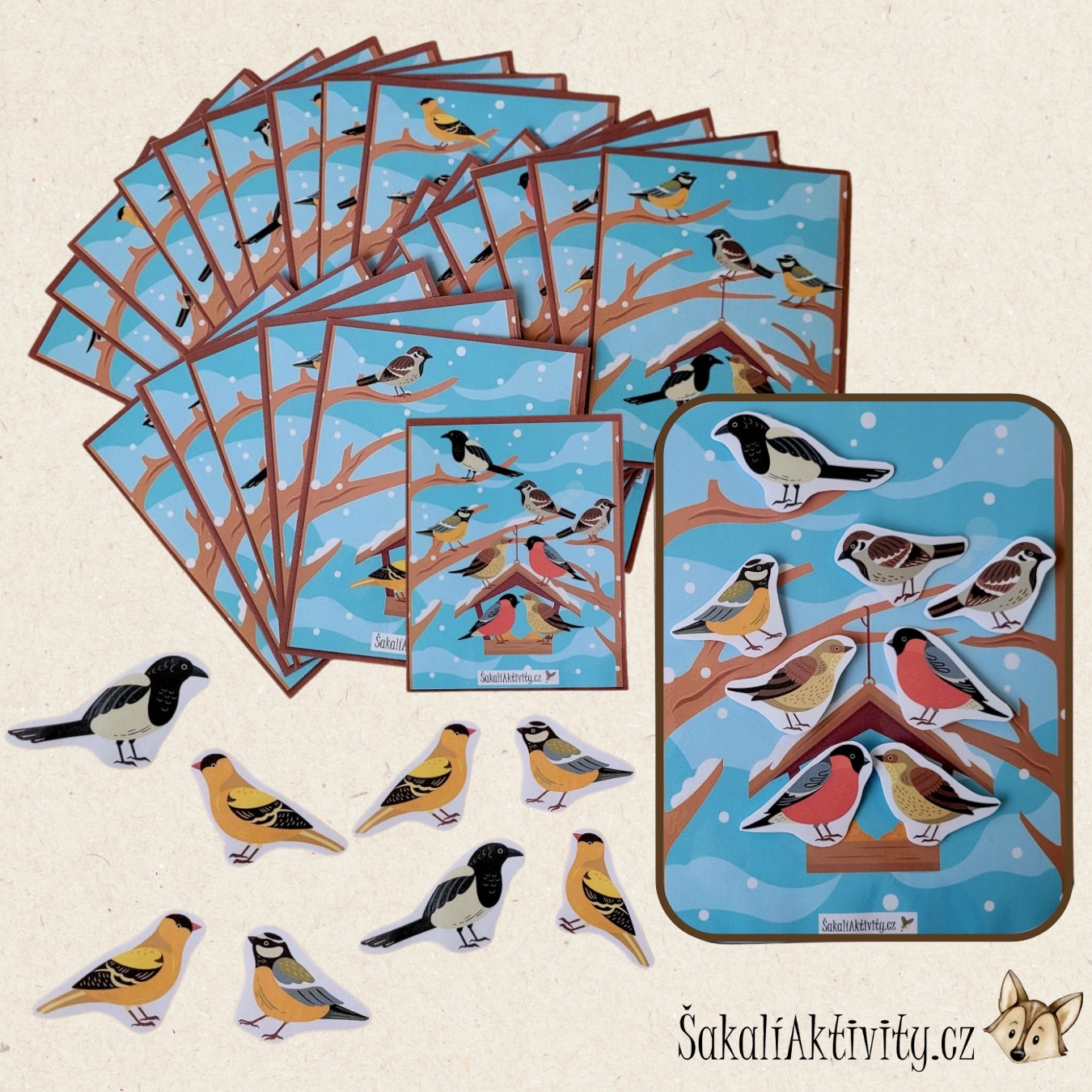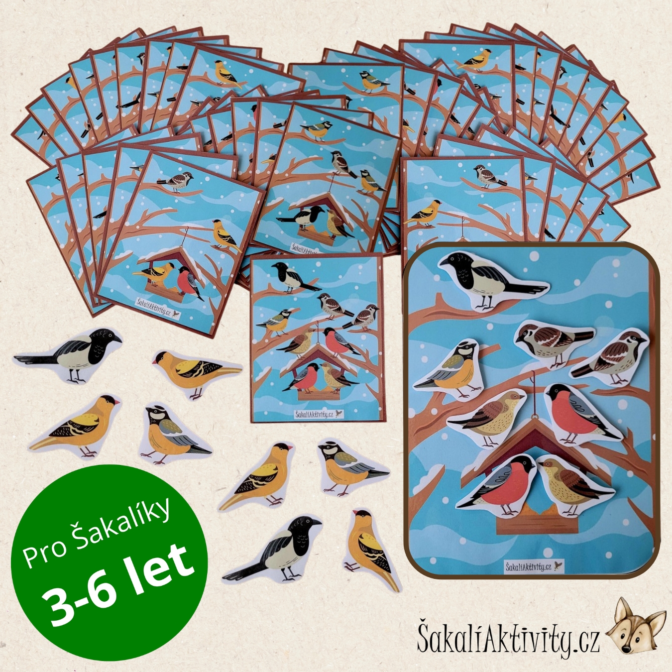 Soubor obsahuje kartu s obrázkem ptačí budky a 12 ks ptáků, se kterými se v zimě na krmítku můžete setkat. Dítě v aktivitě zažívá první početní a prostorovou představivosti, k tomu mu pomáhají předlohové karty s obrázky, podle kterých ptáky na hlavní obrázek přikládá. Současně tak dítě trénuje jemnou motoriku.