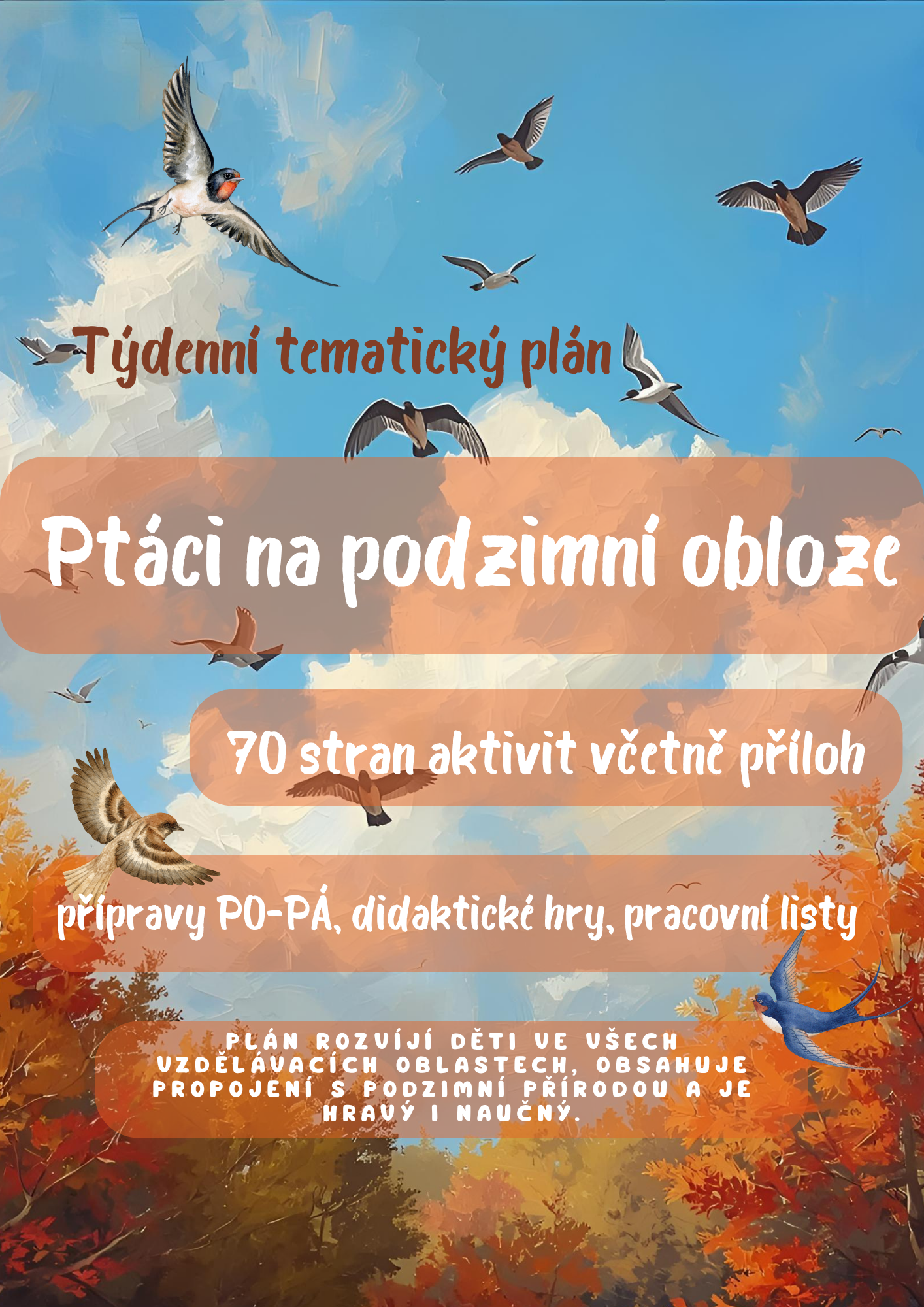 Tento ucelený materiál Vás provede celým týdnem zaměřeným na stěhovavé i stálé ptáky. Najdete v něm přípravy na každý den (PO–PÁ), didaktické hry, pohybové činnosti, pracovní listy i smyslové aktivity. Soubor propojuje podzimní přírodu s environmentální výchovou a přináší dětem nejen nové poznatky, ale i prostor pro hru, tvoření a prožitky.
