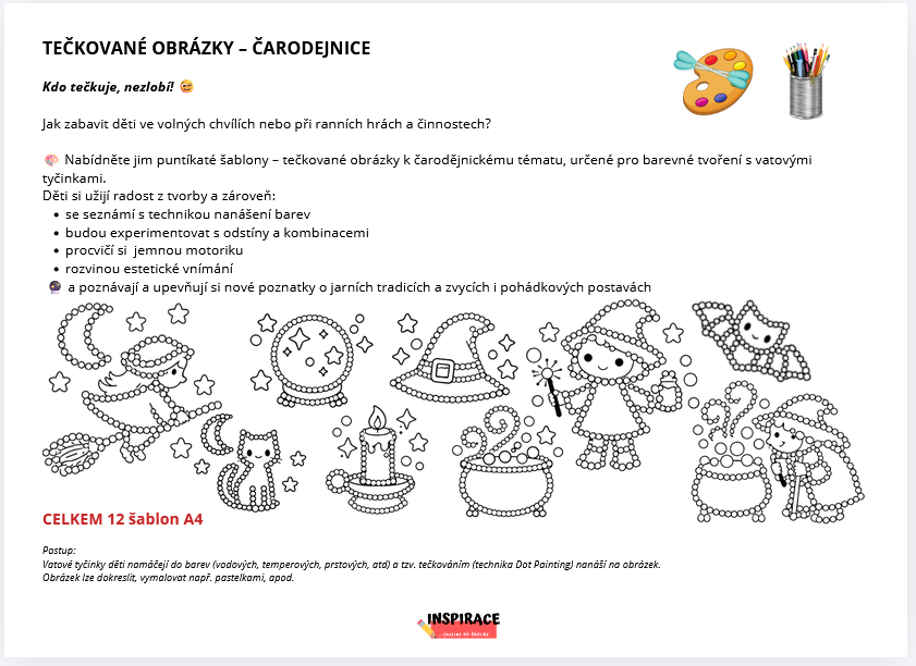 🎨 Nabídněte jim puntíkaté šablony – tečkované obrázky k čarodějnickému tématu, určené pro barevné tvoření s vatovými tyčinkami.