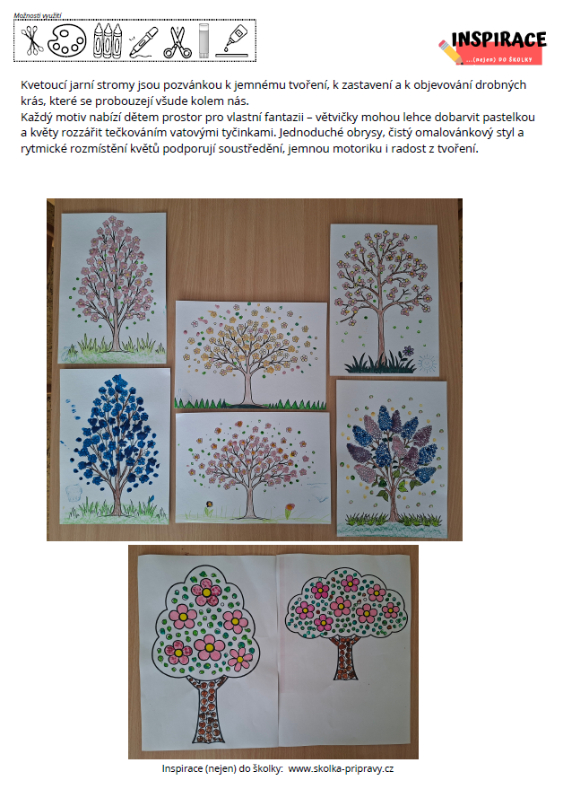 Ať už si děti vyberou magnolii, zlatici, šeřík nebo jarní strom plný květů, každý motiv je otevřený jejich fantazii a barvám, které si samy zvolí. Každý motiv je jemným symbolem jara a tvořivosti, který potěší děti i dospělé.