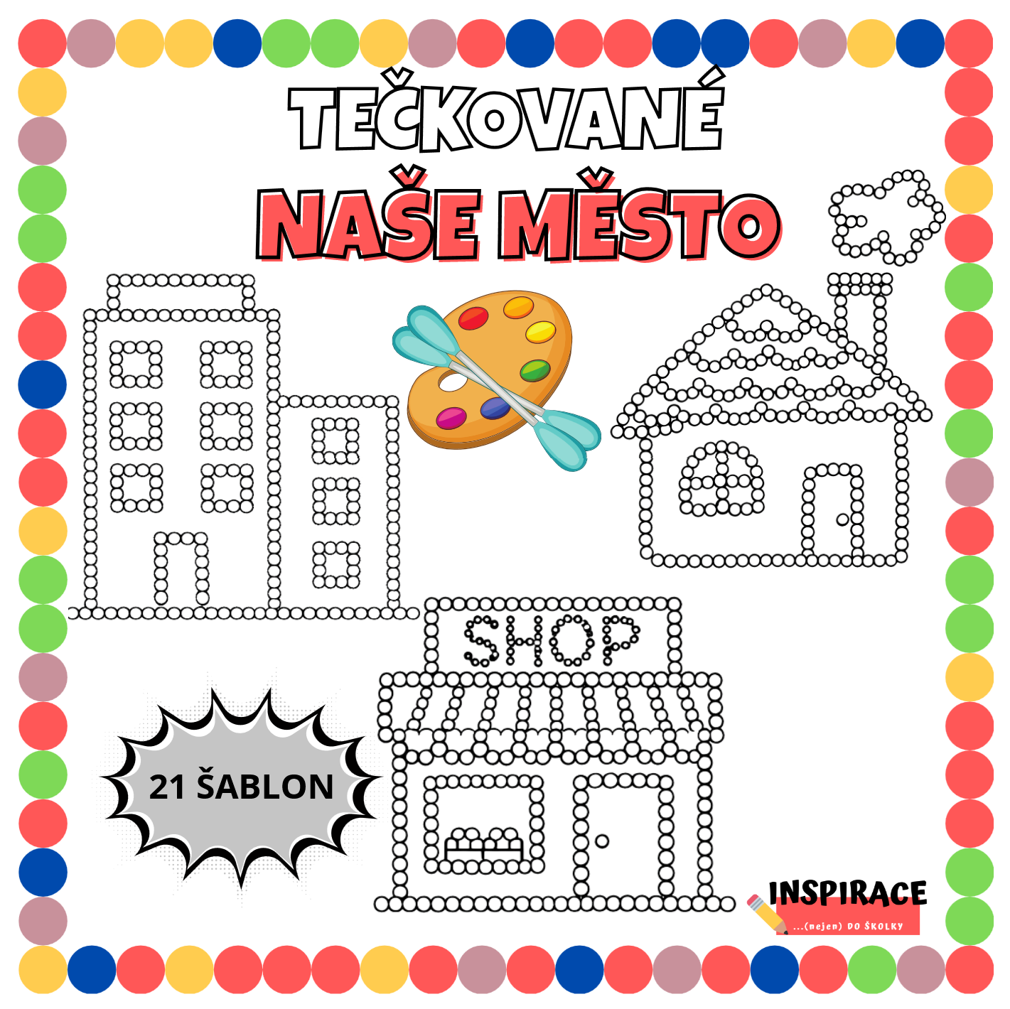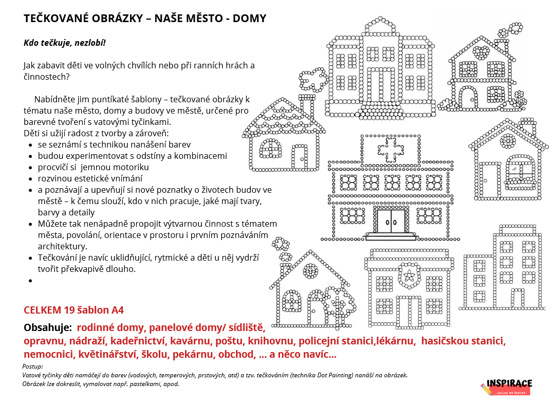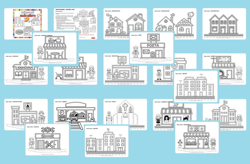 🎨 Nabídněte jim puntíkaté šablony – tečkované obrázky k tématu naše město, domy a budovy ve městě, určené pro barevné tvoření s vatovými tyčinkami.