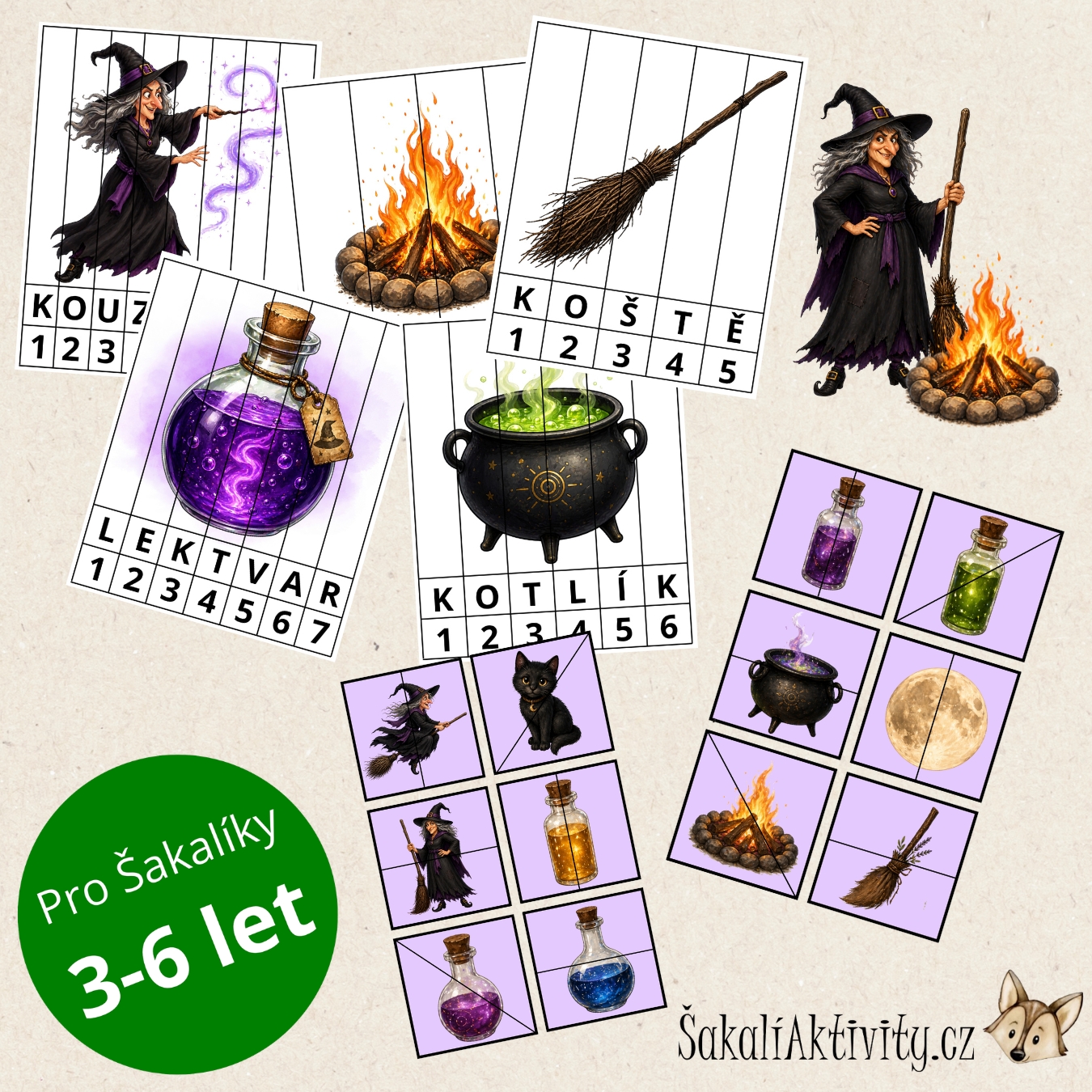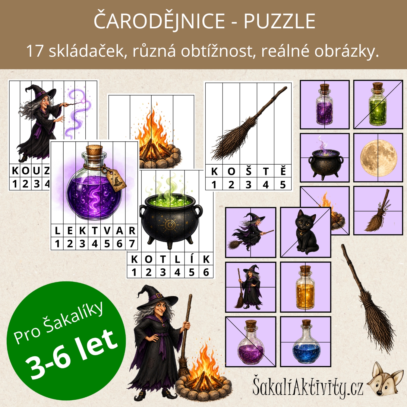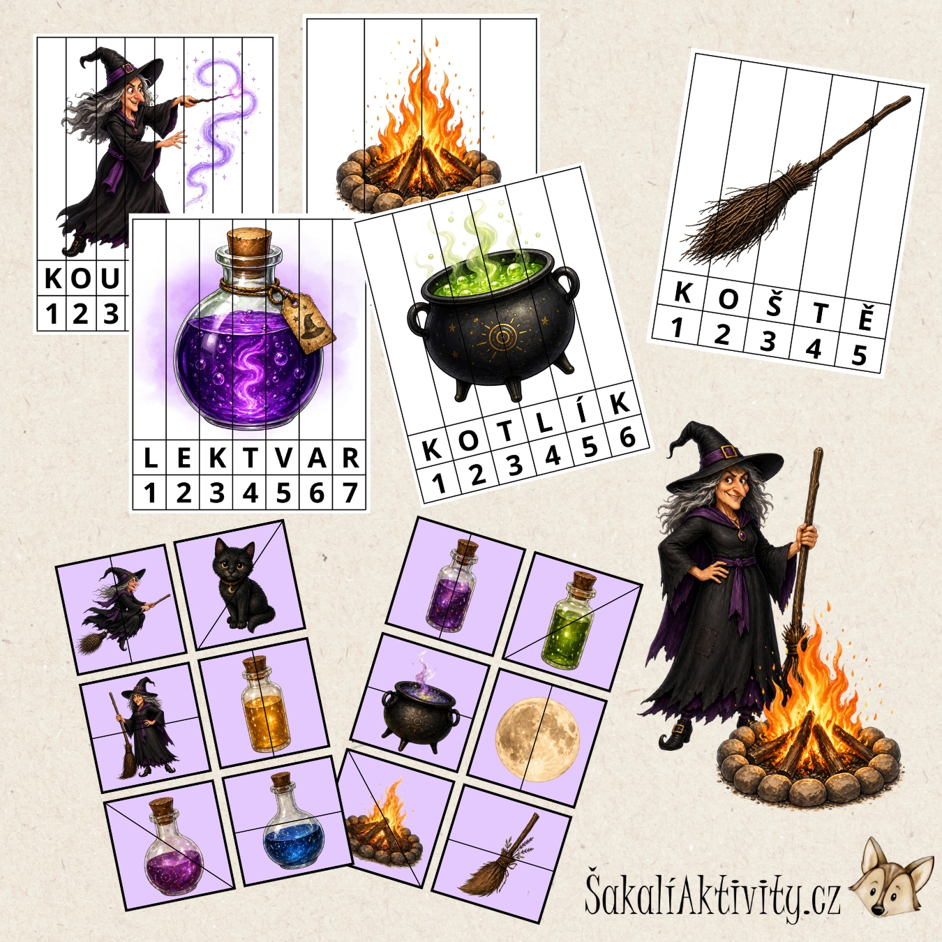Soubor Čarodějnice puzzle od ŠakalíAktivity.cz je hravý vzdělávací materiál určený pro mateřské školy, 1. stupeň základních škol, školní družiny i domácí vzdělávání. Děti se prostřednictvím skládání puzzlí seznamují s tematikou čarodějnic, Filipojakubské noci a pálení čarodějnic.