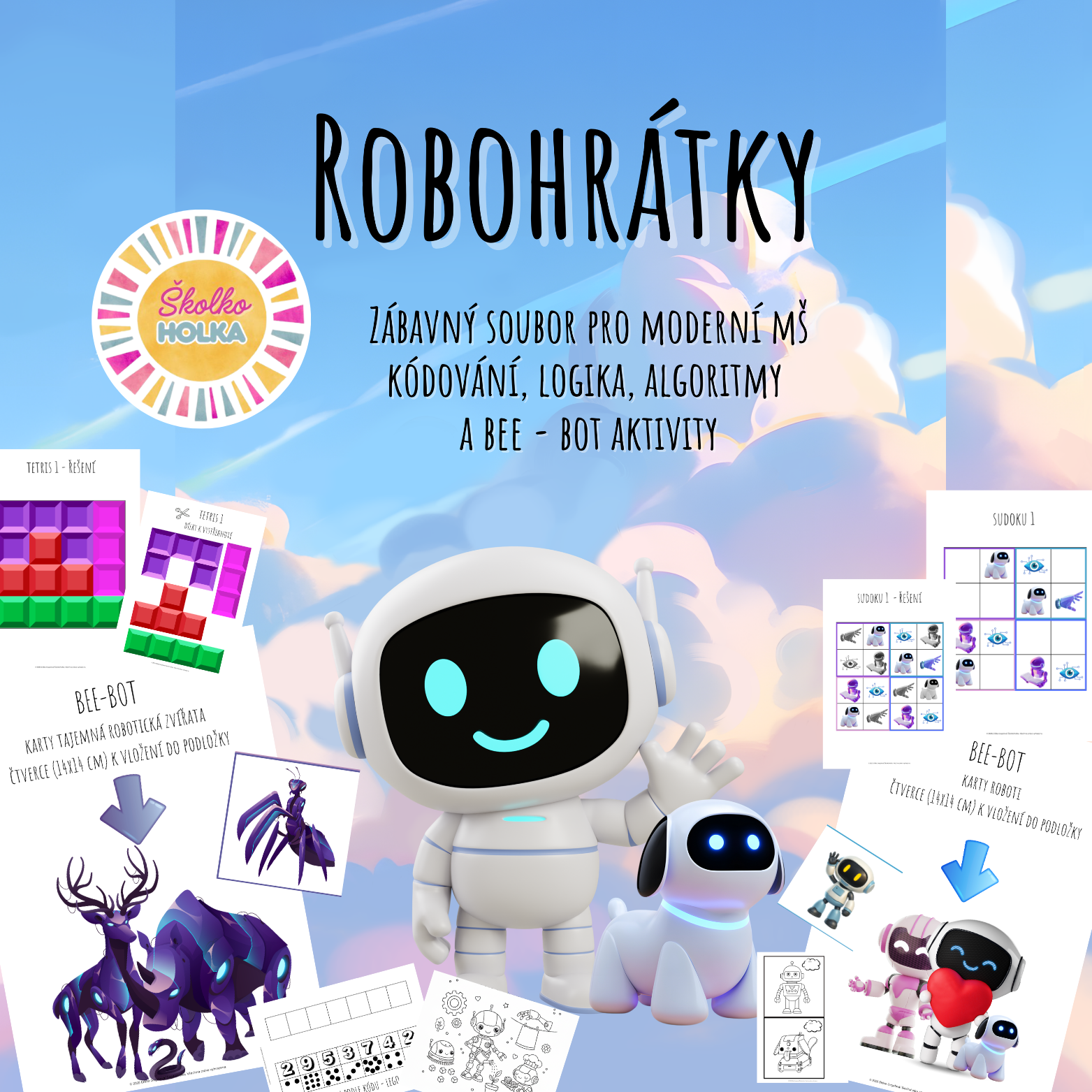 - 🤖Robotí omalovánky: Zábavné a volné omalovánky s robotickou tematikou, které skvěle poslouží jako doplňková relaxační aktivita, nebo jako odměna za zvládnutí úkolu.