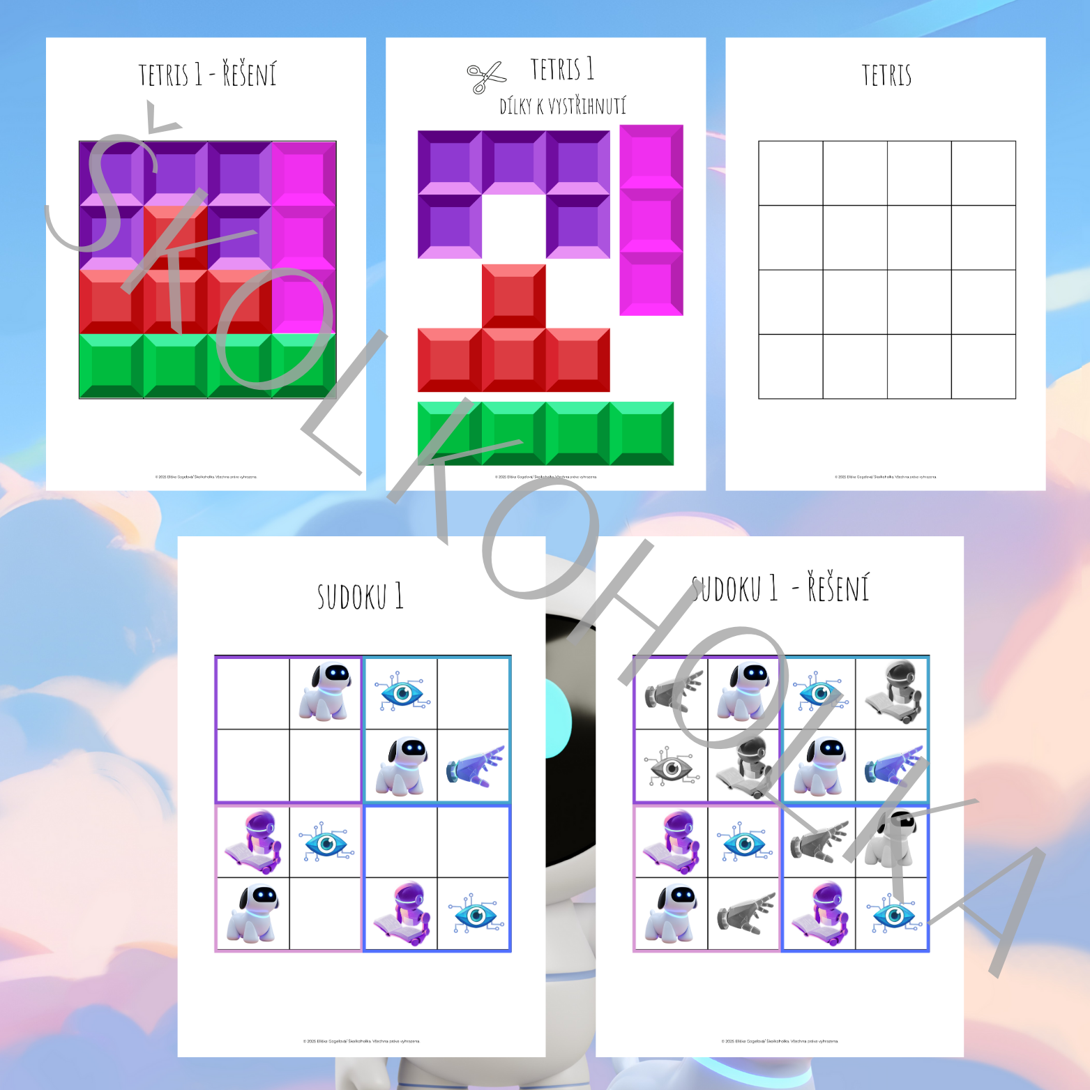 - 🤖Robotické Sudoku: Sady vizuálních Sudoku 4x4, které učí děti logickému usuzování a eliminaci. Součástí je vždy i řešení pro učitele pro rychlou kontrolu.
