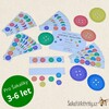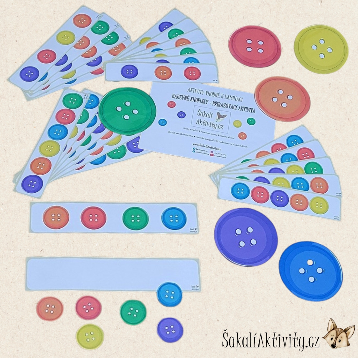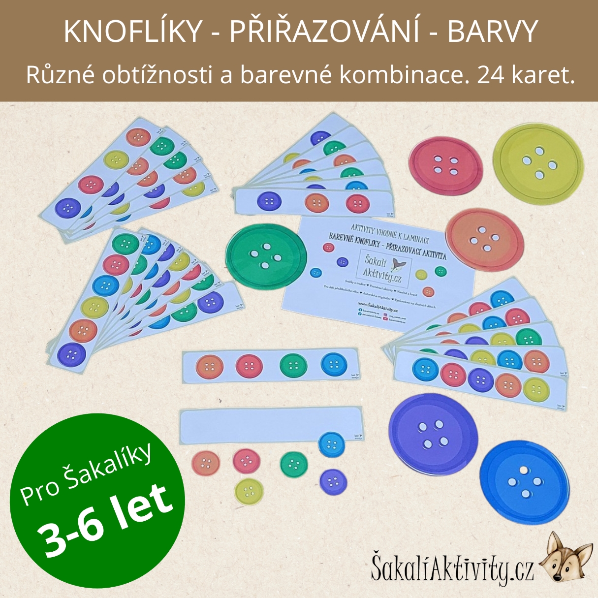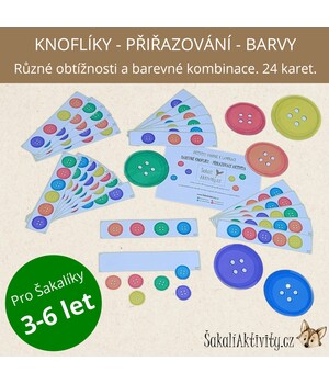 Soubor obsahuje celkem 24ks předlohových karet s různými obtížnostmi (3, 4, 5, 6 knoflíků), kde dítě přiřazuje stejné barevné kombinace na volnou kartu. Součástí jsou také knoflíky v nadměrné velikosti, aby aktivita zaujala skutečně všechy. Můžete si tak vybrat jaká varianta vyhovuje právě Vám a Vašim dětem! Aktivitu lze používat také pomocí samolepících suchých zipů. Není to však potřeba.