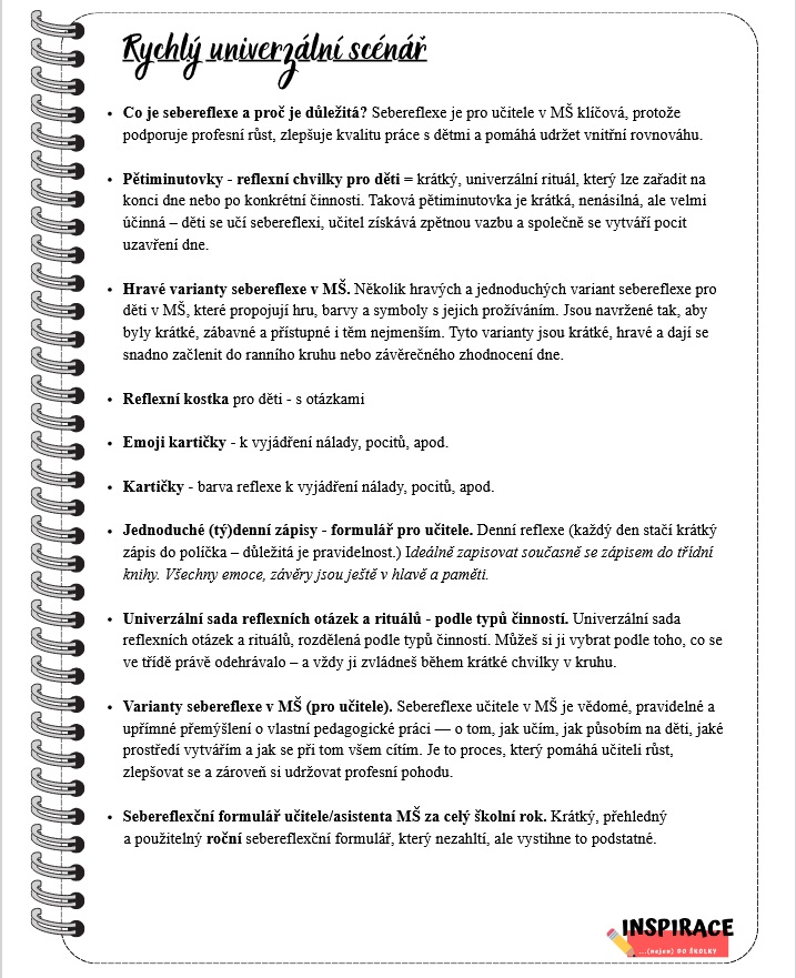 - INSPIRACE - Varianty sebereflexe v MŠ (pro učitele). Sebereflexe učitele v MŠ je vědomé, pravidelné a upřímné přemýšlení o vlastní pedagogické práci — o tom, jak učím, jak působím na děti, jaké prostředí vytvářím a jak se při tom všem cítím. Je to proces, který pomáhá učiteli růst, zlepšovat se a zároveň si udržovat profesní pohodu.