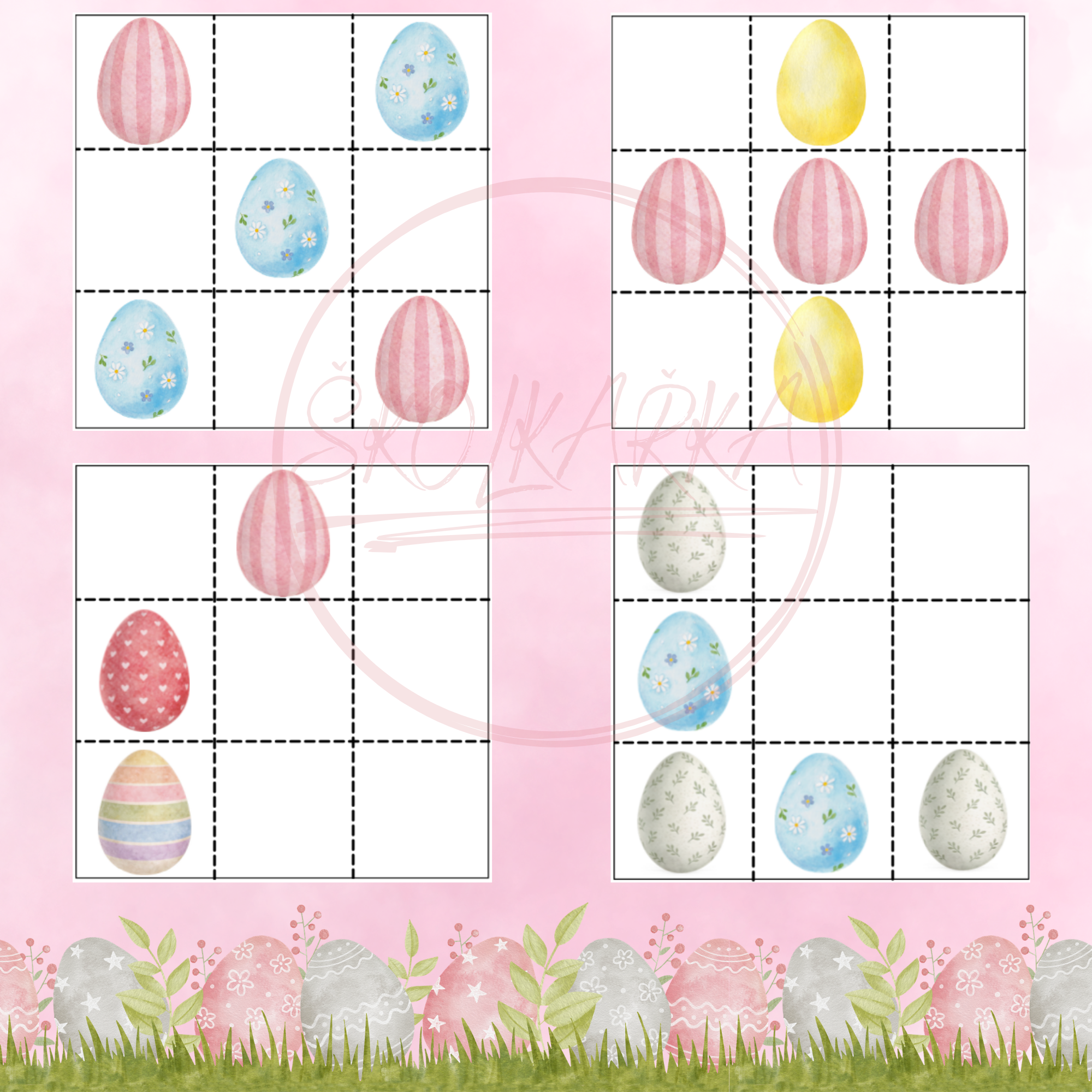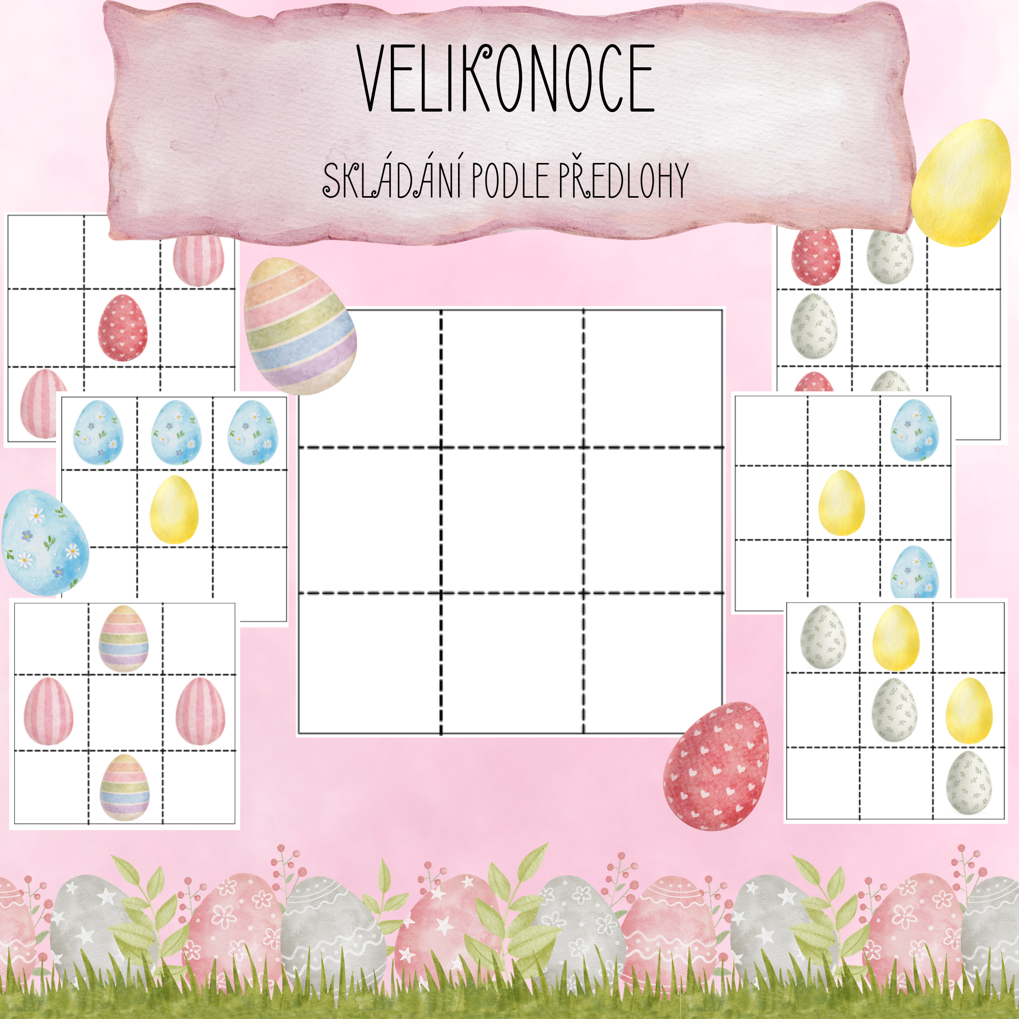POSTUP: AKTIVITA SPOČÍVÁ V TOM, ŽE DÍTĚ OBDRŽÍ PRÁZDNOU TABULKU A NÁSLEDNĚ SI VYBÍRÁ KARTIČKY S PŘEDLOHOU, PODLE KTERÝCH BUDE UMÍSŤOVAT JEDNOTLIVÉ OBRÁZKY TAK, ABY VYTVOŘILY STEJNÝ VZOR.