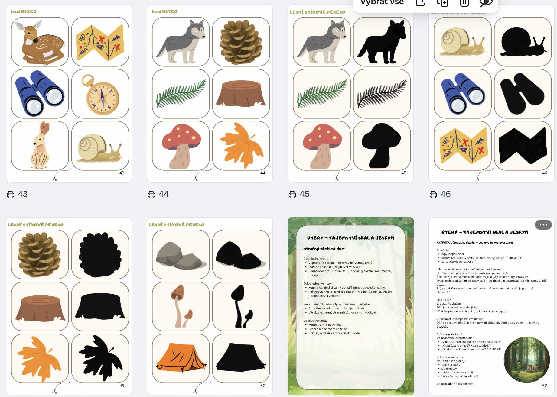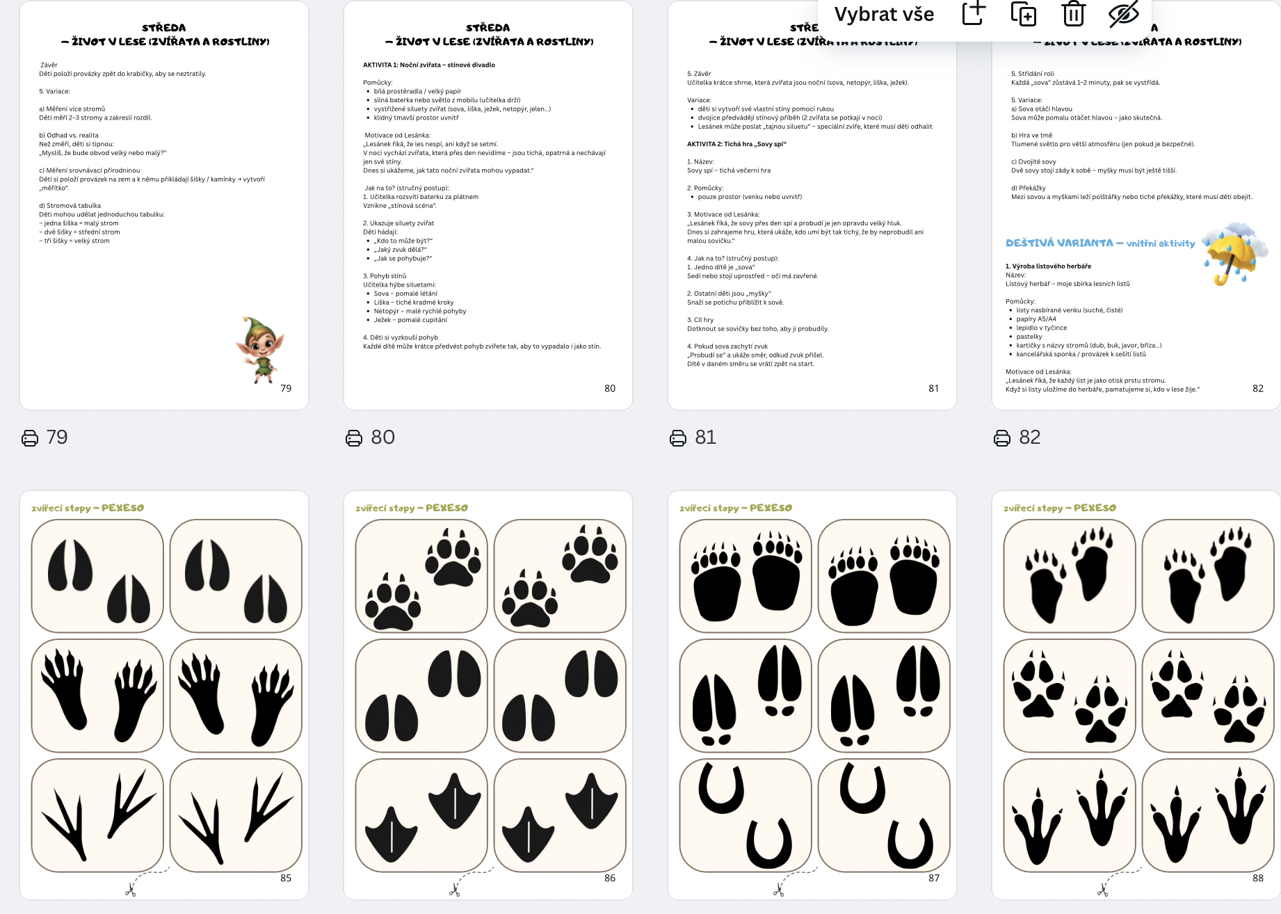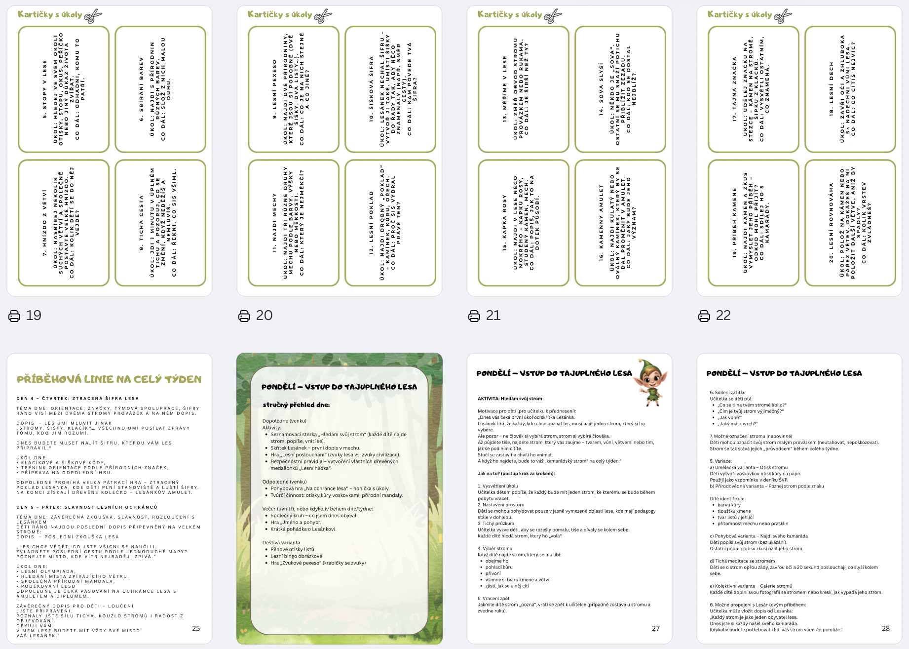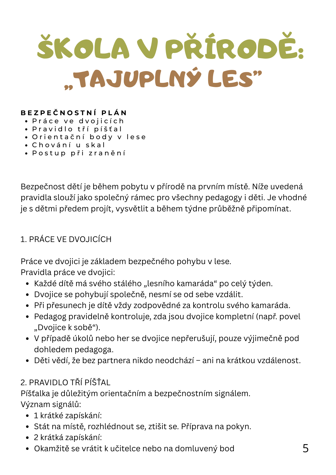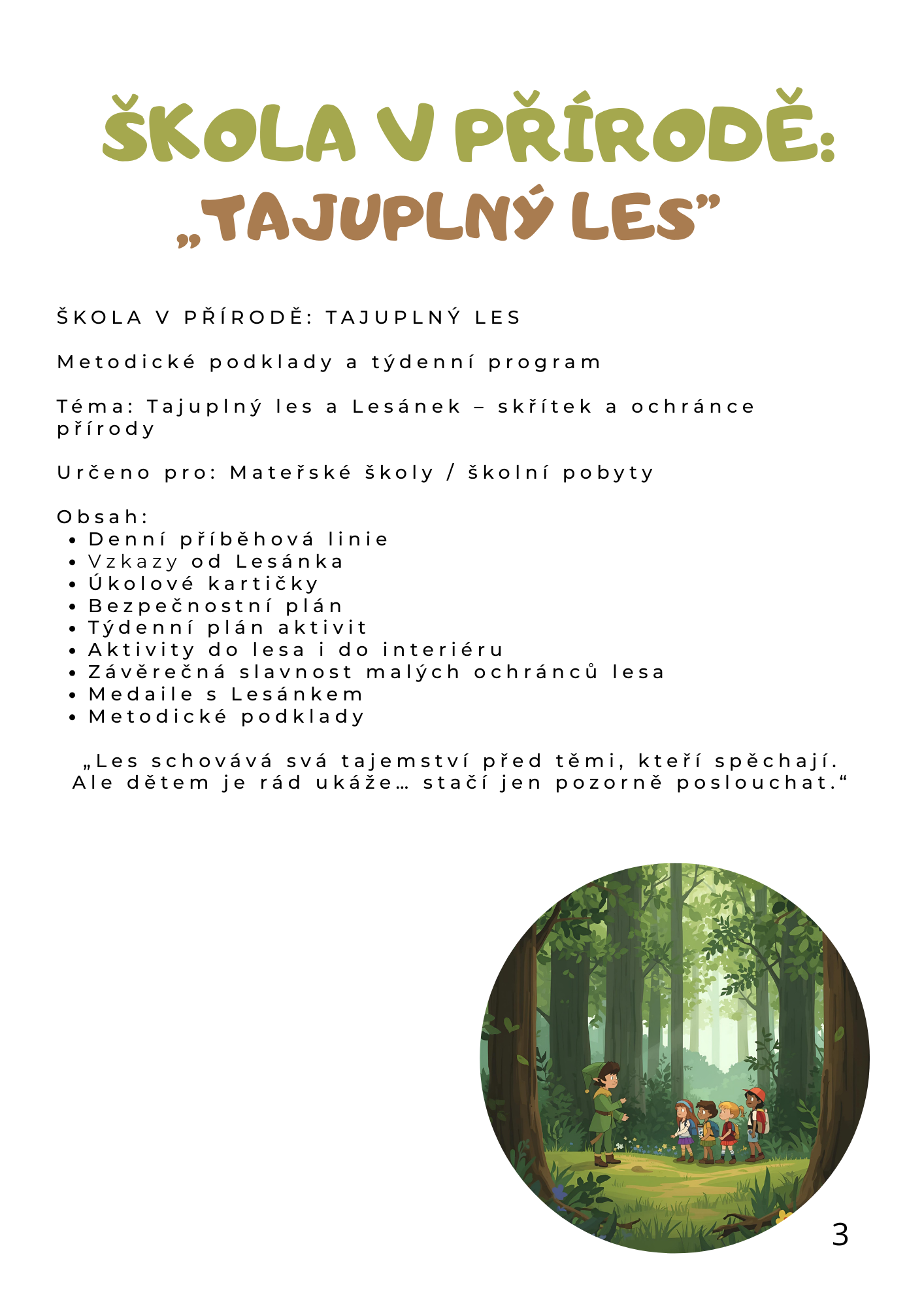 Kompletní metodický soubor Tajuplný les – škola v přírodě (132 stran) nabízí ucelený týdenní program do MŠ i na 1. stupeň ZŠ. Najdete v něm denní plány, příběhovou linku se skřítkem Lesánkem, venkovní i deštivé aktivity, bezpečnostní pravidla, pátrací hru, lesní olympiádu a tiskové přílohy.