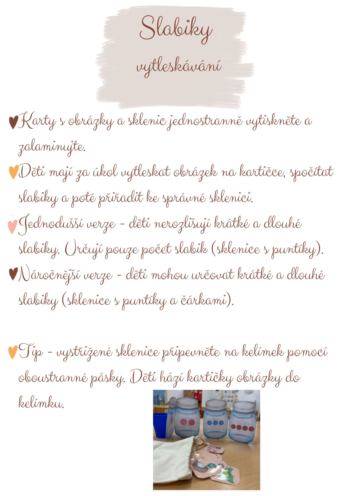 Dítě si vylosuje kartičku, vytleská slabiky a přiřadí ke správné sklenici dle počtu slabik. Starší děti mohou určovat i krátké a dlouhé slabiky. Tip - vystřižené sklenice přilepte na kelímek či jinou nádobu a děti mohou obrázky do sklenice vhazovat.