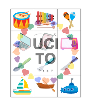 (nářadí, nábytek, hračky, příbor, nádobí, oblečení, boty, pokrývky hlavy, trička, zvířata, ryby, hmyz, divoká zvířata, domácí zvířata, zvířata na farmě, ptáci, nápoje, zelenina, ovoce, pečivo, stromy, květiny, povolání, členové rodiny, sporty, potraviny, sladkosti, hygienické potřeby, budovy, obchody, služby, místnosti, počasí, hudební nástroje, elektronika, dopravní prostředky, lodní doprava, letecká doprava, pozemní doprava, spotřebiče)