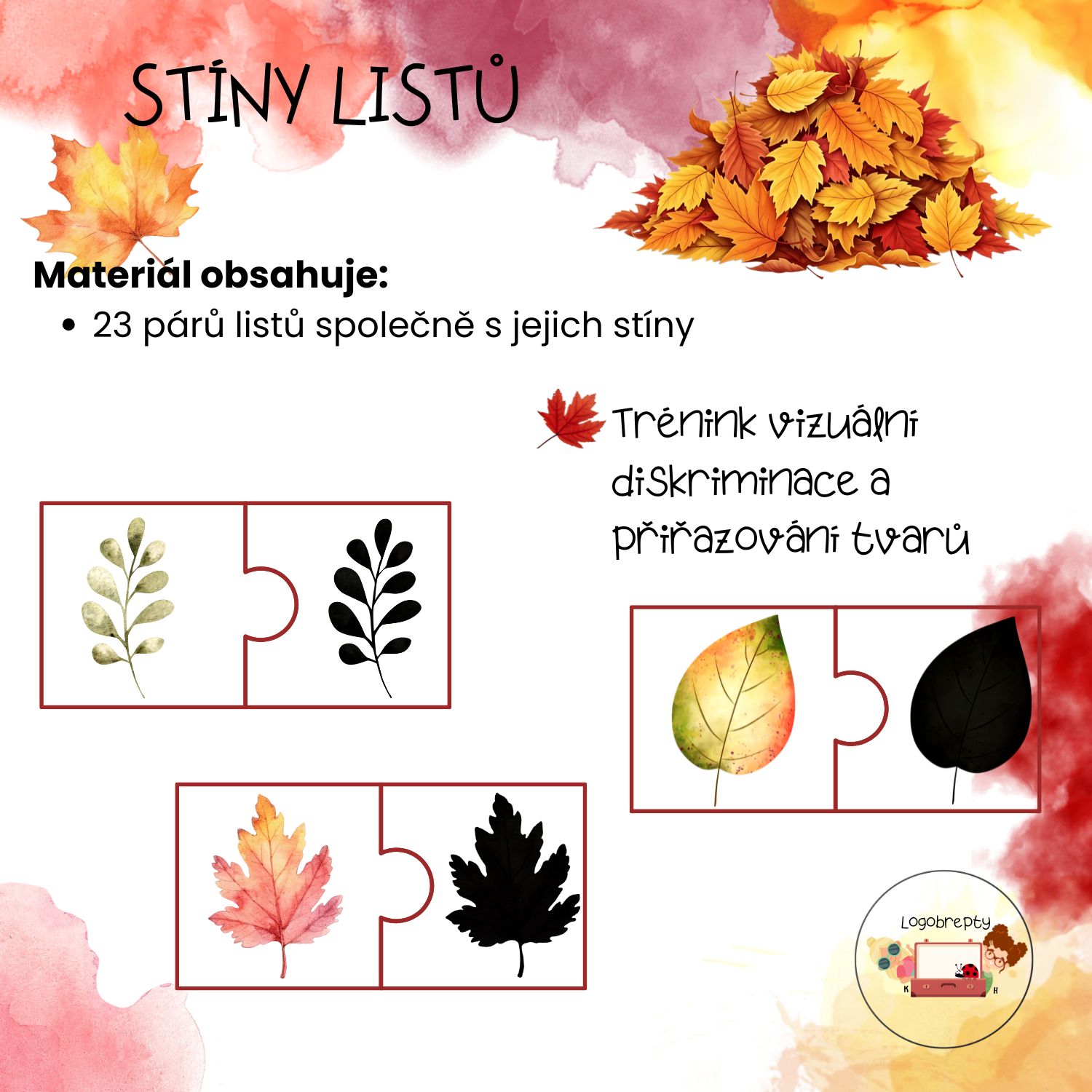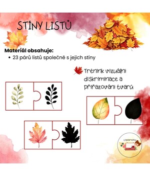 Didaktická pomůcka zaměřená na rozvoj vizuálního vnímání, pozornosti a schopnosti přiřazování. Sada obsahuje obrázky různých listů a jejich stíny ve formě puzzlí.