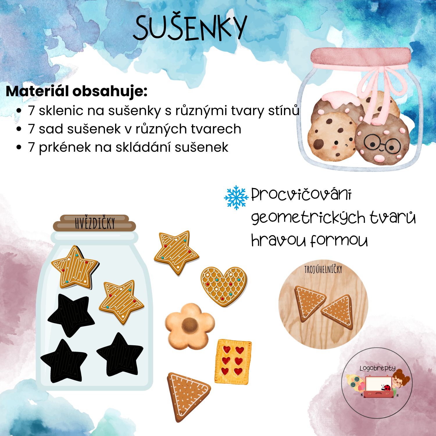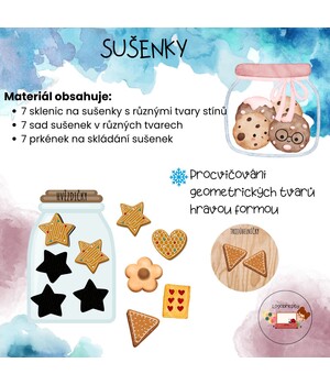Děti přiřazují sušenky ke správným sklenicím podle stínů a trénují tak pozorování i přesnost. Pro starší nebo zkušenější skupiny je připravena i náročnější varianta: učitel přečte název tvaru a dítě vyhledá odpovídající sušenky a uloží je na prkénko. Jednoduchý princip, ale skvěle rozvíjí soustředění i jazykové dovednosti.