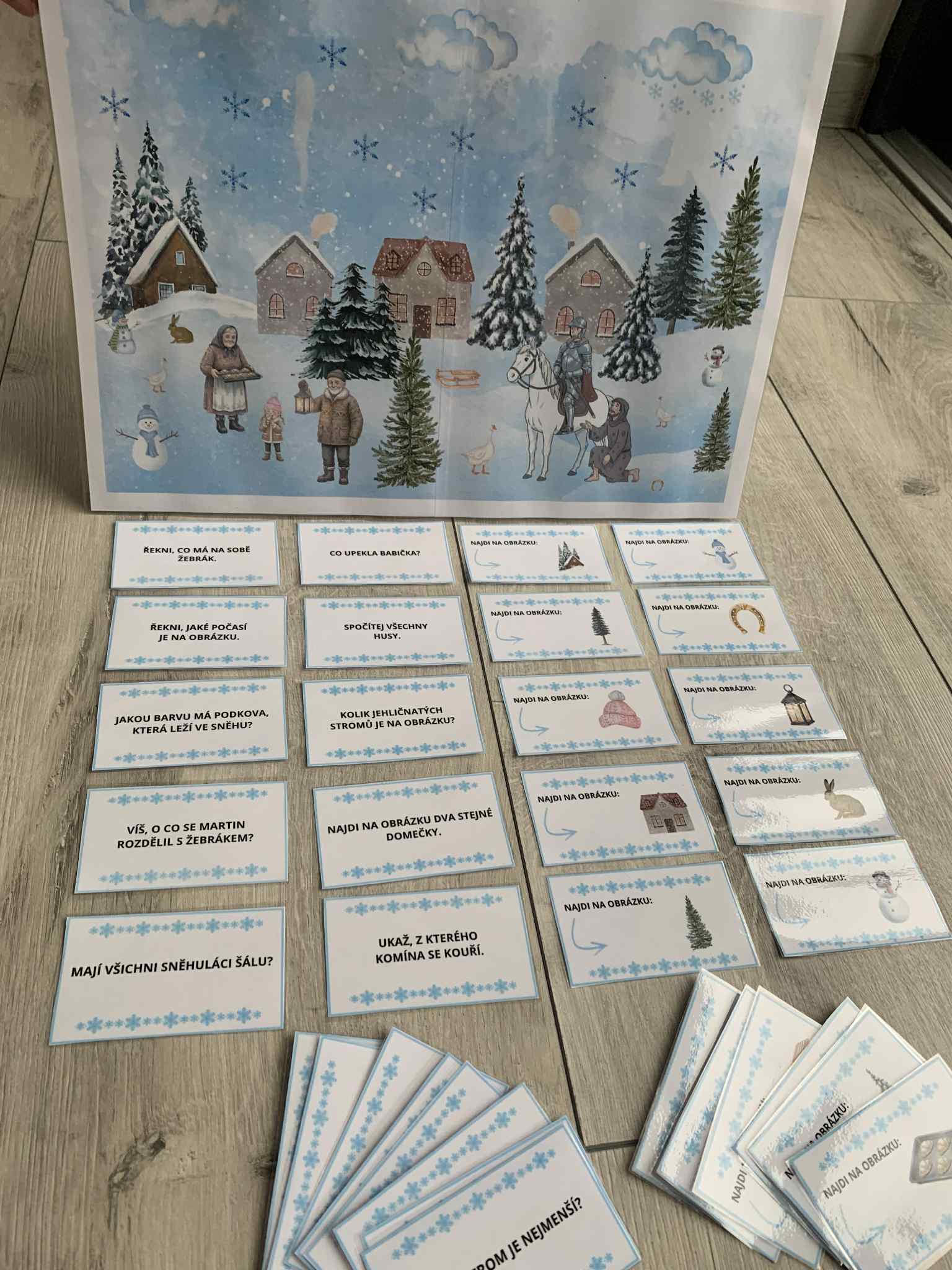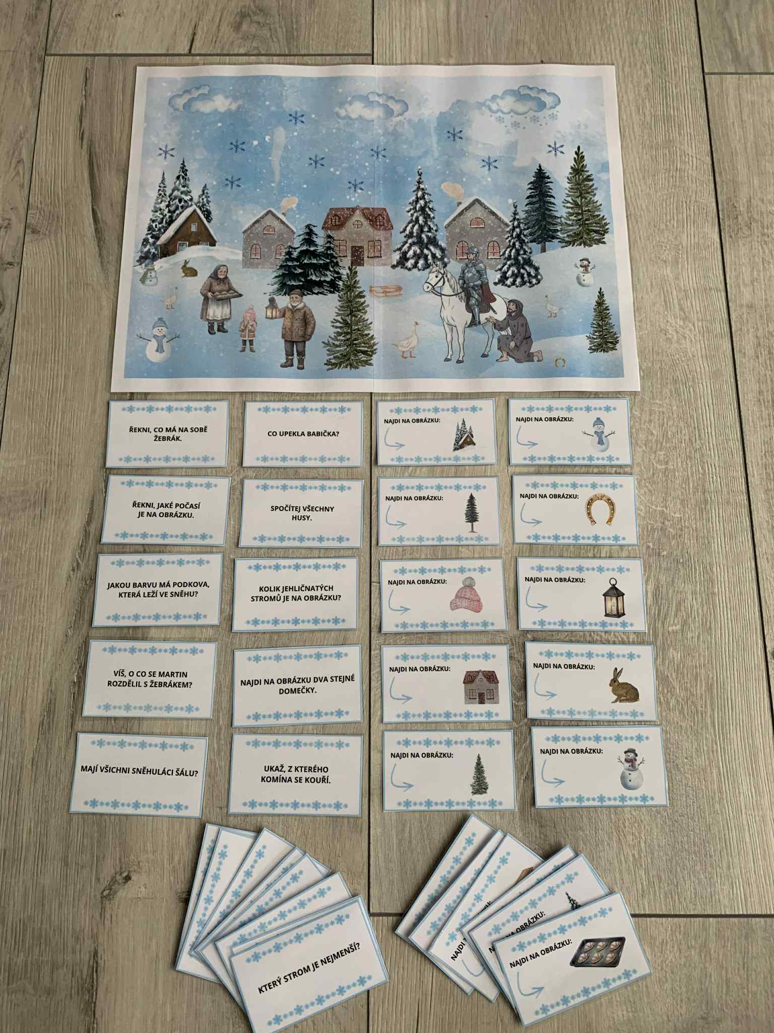 - 18 kartiček s textem (např. Kolik je na obrázku mužů? Co má na sobě žebrák?...