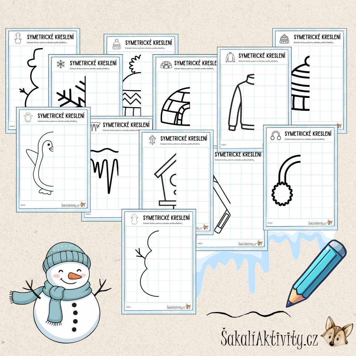 ❄️ V souboru najdete obrázky inspirované zimou, sněhem a sněhuláky, které jsou rozděleny na poloviny. Úkolem dítěte je vždy dokreslit chybějící část obrázku podle předlohy vlevo, čímž si přirozeně osvojuje pojem symetrie a vnímání osy.