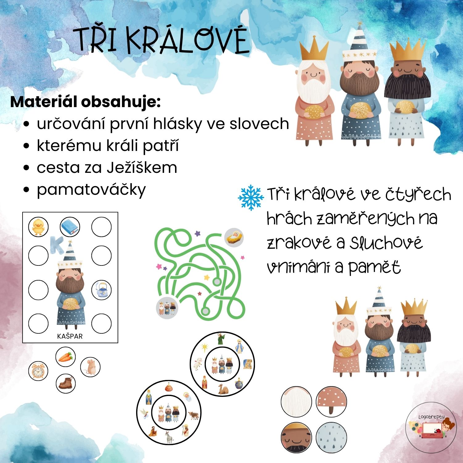 Soubor Tři králové obsahuje sadu tematických her pro děti předškolního věku. Hravou formou se zaměřuje na sluchové a zrakové vnímání, zrakovou paměť, pozornost a práci s obrázkem.