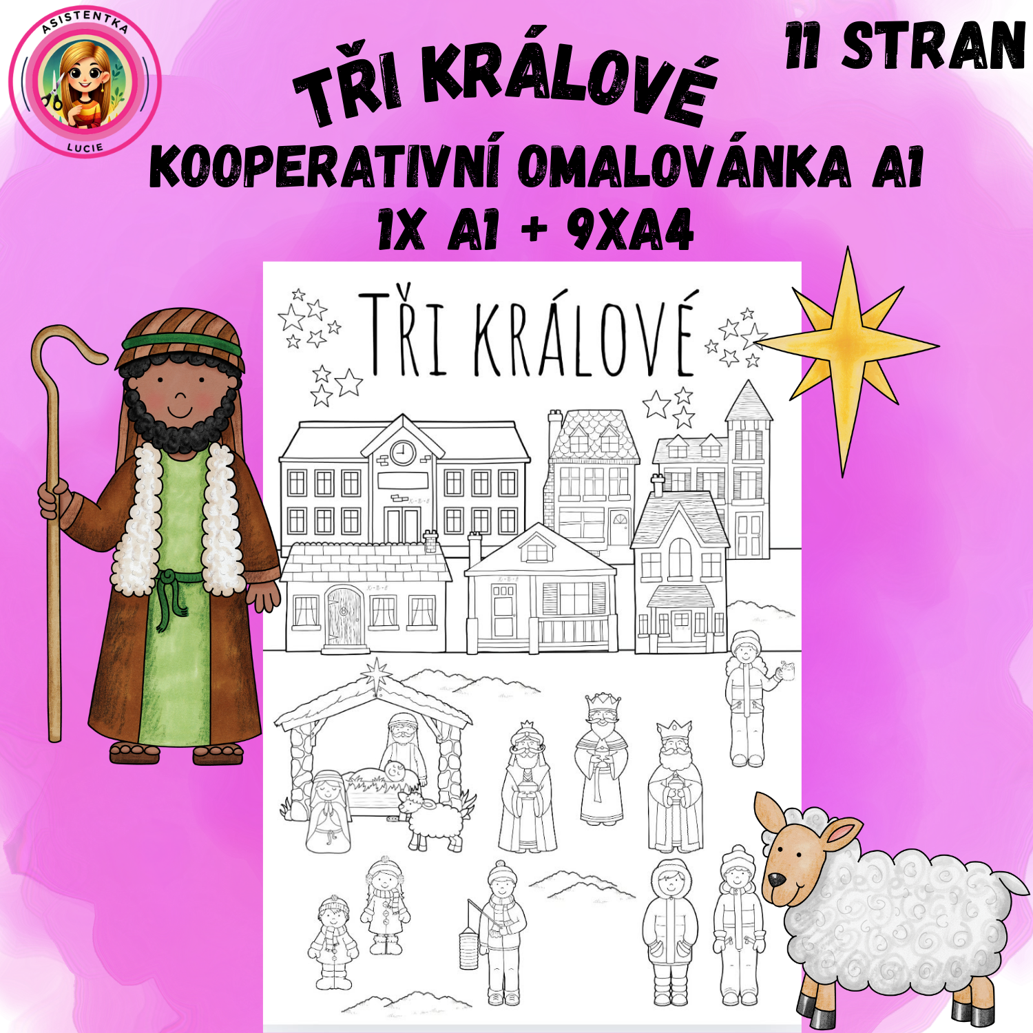 Kooperativní omalovánka je výtvarná aktivita zaměřená na spolupráci, komunikaci a společné tvoření. Děti pracují na jednotlivých částech obrázku, které po dokončení vytvoří jeden celek. Materiál podporuje pozitivní třídní atmosféru, rozvíjí sociální dovednosti a nabízí klidnou, tvořivou činnost vhodnou zejména po návratu po vánočních prázdninách. Obsahuje 1x velikost A1 a 9x velikost A4 ke složení.