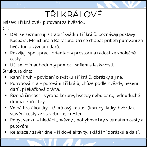 ✅ Ideální pro období po Vánocích – propojuje tradice, pohyb, klid i spolupráci a pomáhá dětem pochopit svátek Tří králů přirozeně a srozumitelně.