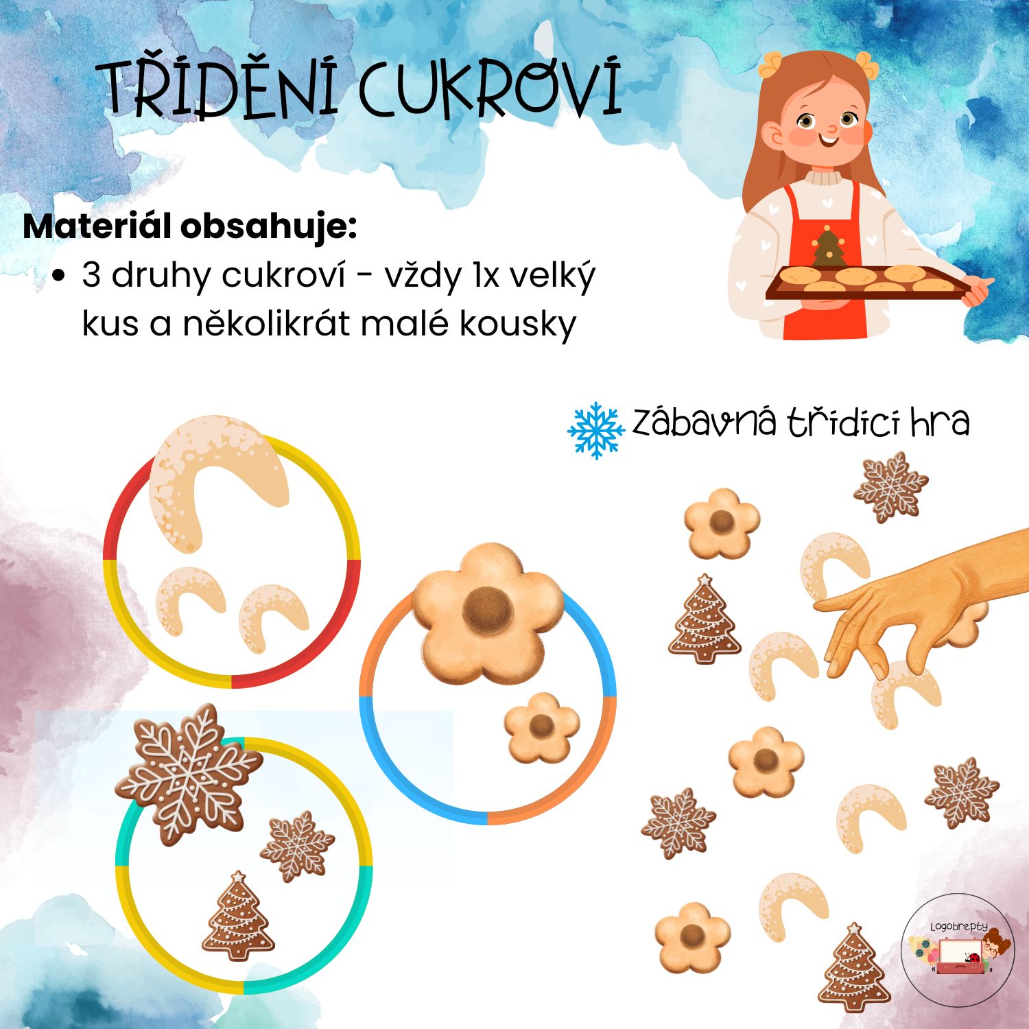 Tato pohybová a třídicí aktivita přináší dětem radost z hledání, sbírání i spolupráce. Ve třídě vyhradíte tři místa (např. obruče), do kterých umístíte velké obrázky jednotlivých druhů cukroví. Menší kartičky potom rozházíte po prostoru.