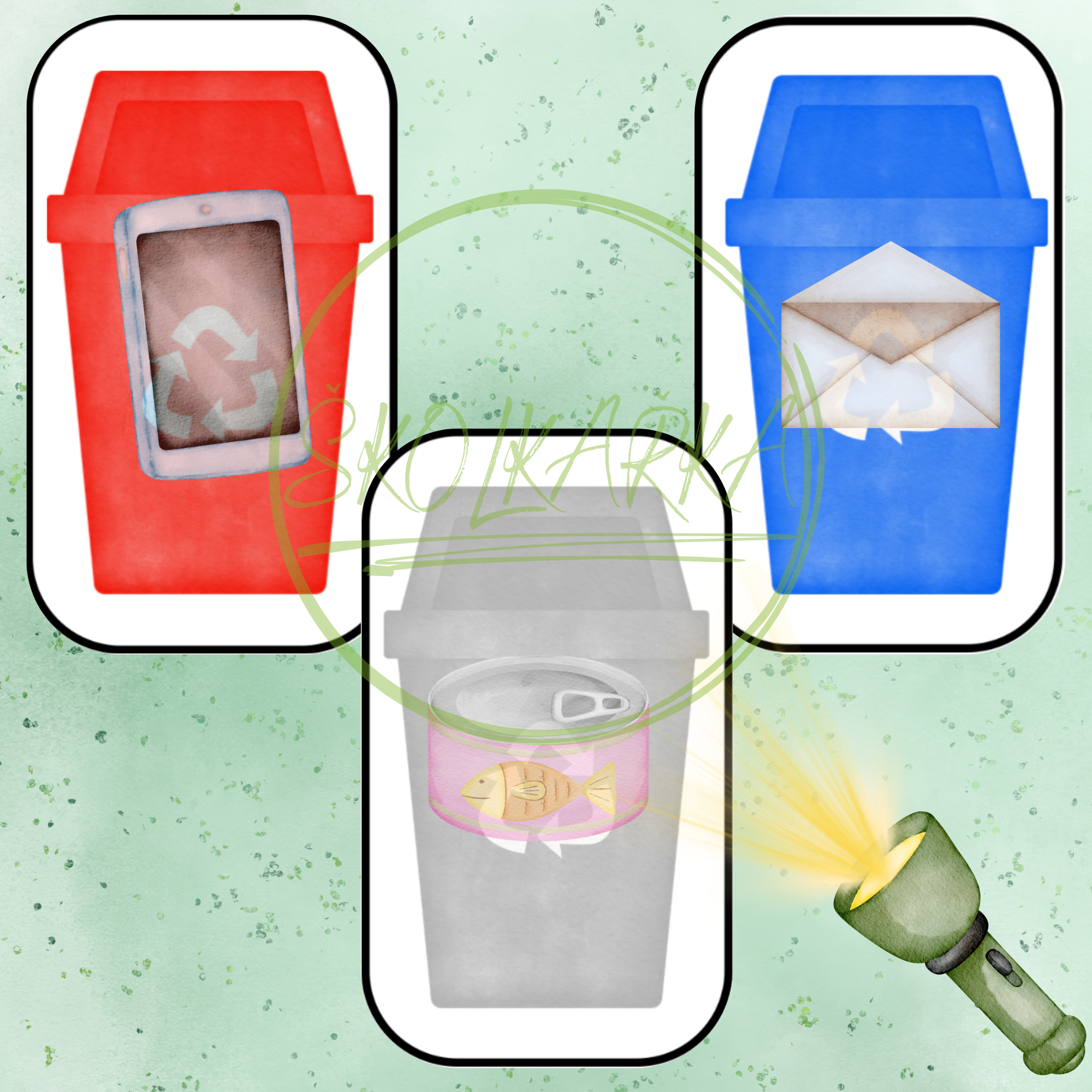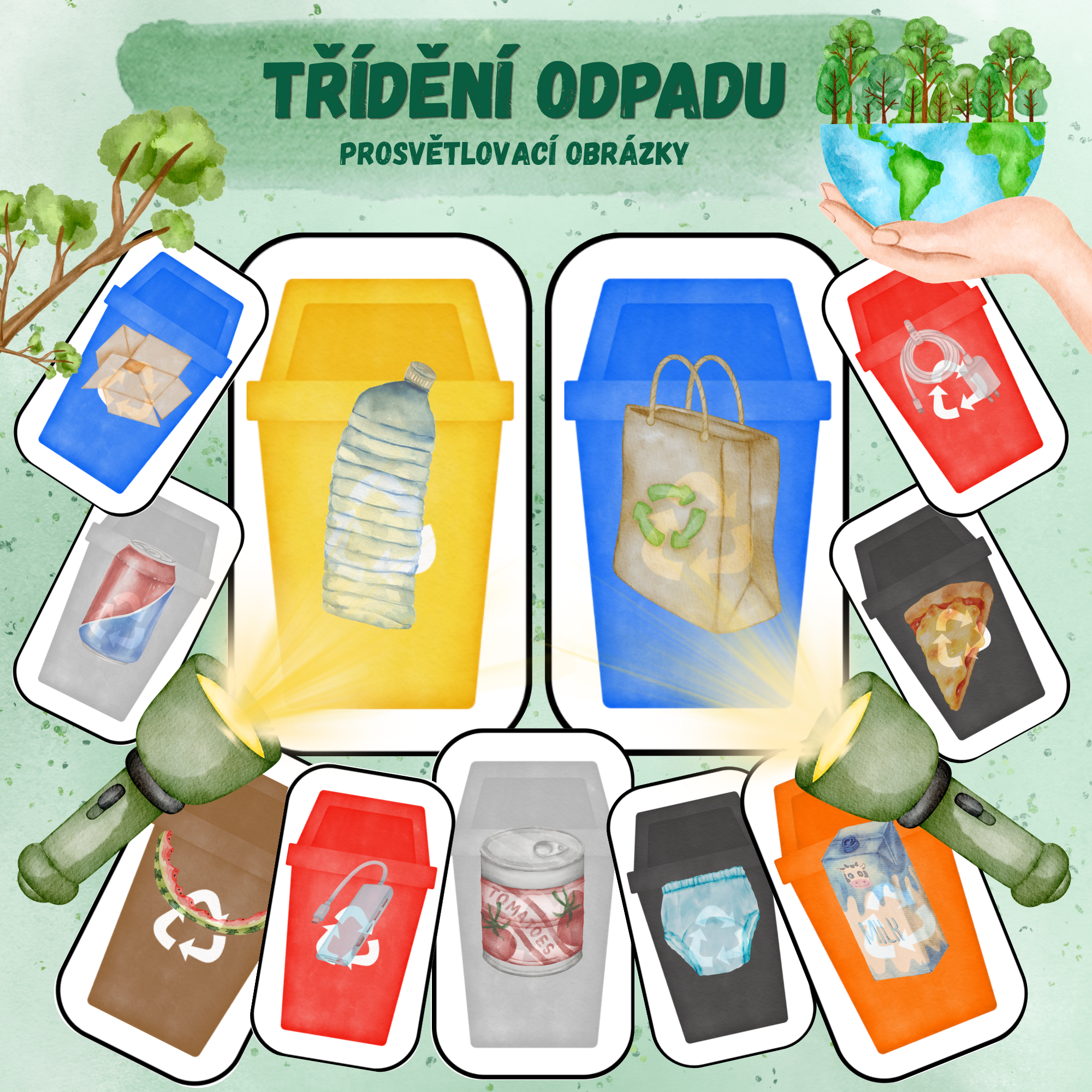 - Dítě si vybere libovolnou kartičku s popelnicí a pomocí světla zkoumá, jaký obrázek se uvnitř skrývá. Následně objevuje různé obrázky, které využijeme s dítětem k popisu - podporujeme kladení otázek, hledání souvislostí, rozšiřujeme slovní zásobu, procvičujeme souvislé vyjadřování a prohlubujeme diskuzi o správném třídění odpadu.