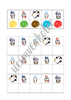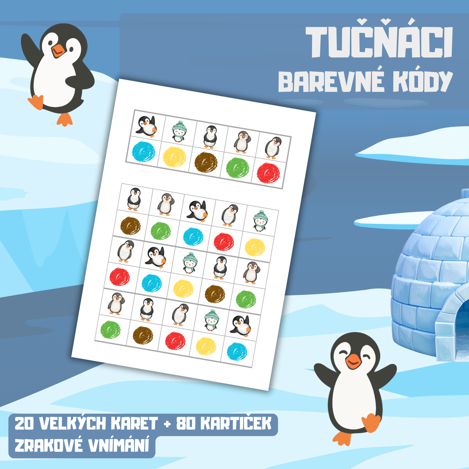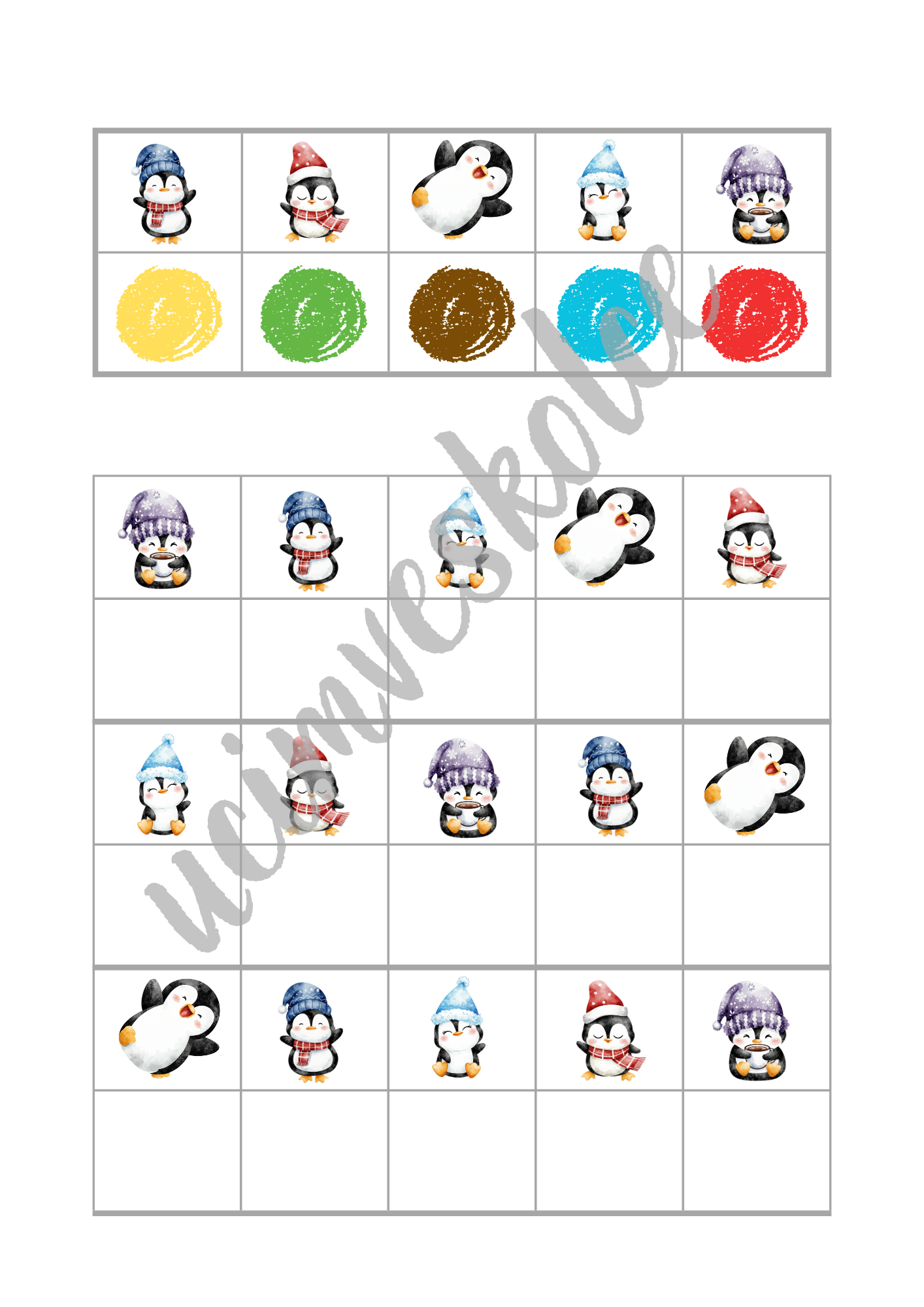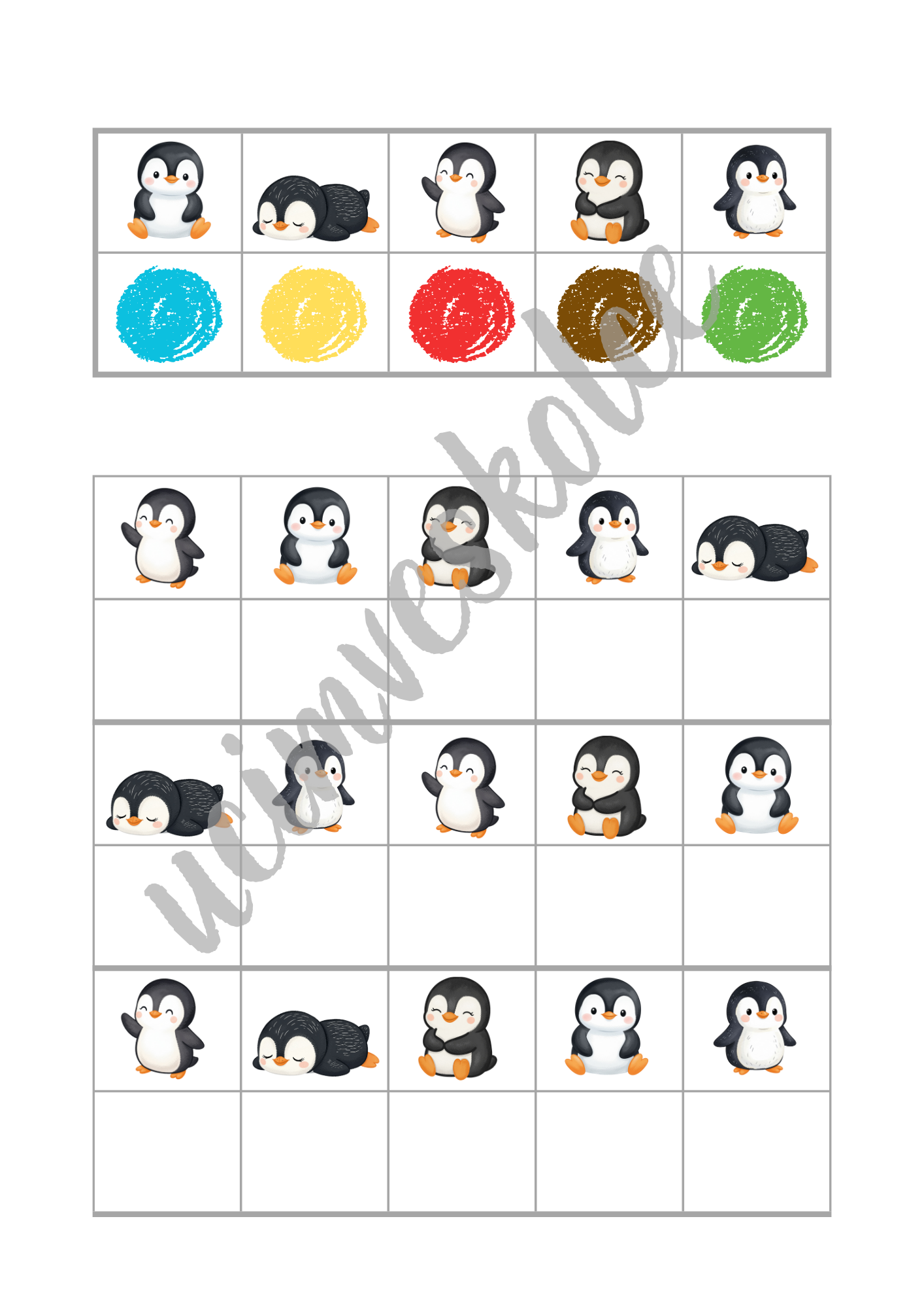 - Ve formátu velkých (zalaminovaných) karet: Po vytisknutí jednotlivé listy (str. 4-23) pro delší výdrž zalaminujte (celkem 20 velkých karet). Strany 22-24 také pro delší výdrž zalaminujte a poté z nich vystřihněte malé kartičky s obrázky barevných puntíků (celkem 80 kartiček). Na každé velké kartě jsou dvě tabulky. První tabulka je v horní části. V prvním řádku této tabulky je 5 políček s obrázky různých tučňáků. V druhém řádku této tabulky je 5 políček s různě barevnými puntíky. Políčku s obrázkem tučňáka v prvním řádku je přiřazeno políčko s barevným puntíkem pod ním. V druhé tabulce, která se nachází níže, je celkem 6 řádků. V každém lichém řádku (první, třetí, pátý) je 5 políček s obrázky tučňáků. V každém sudém řádku (druhý, čtvrtý, šestý) je 5 prázdných políček. Úkolem dětí je do prázdných políček umístit kartičku s puntíkem správné barvy (kartičky ze str. 24-25). Podle vzoru v první tabulce v horní části karty může provést kontrolu pedagog či dítě samotné. Velké zalaminované karty lze využít též bez malých kartiček. Děti mohou do prázdných políček zakreslovat barevné puntíky smazatelnými fixy, přikládat do prázdných políček barevné knoflíky, kostky atd.