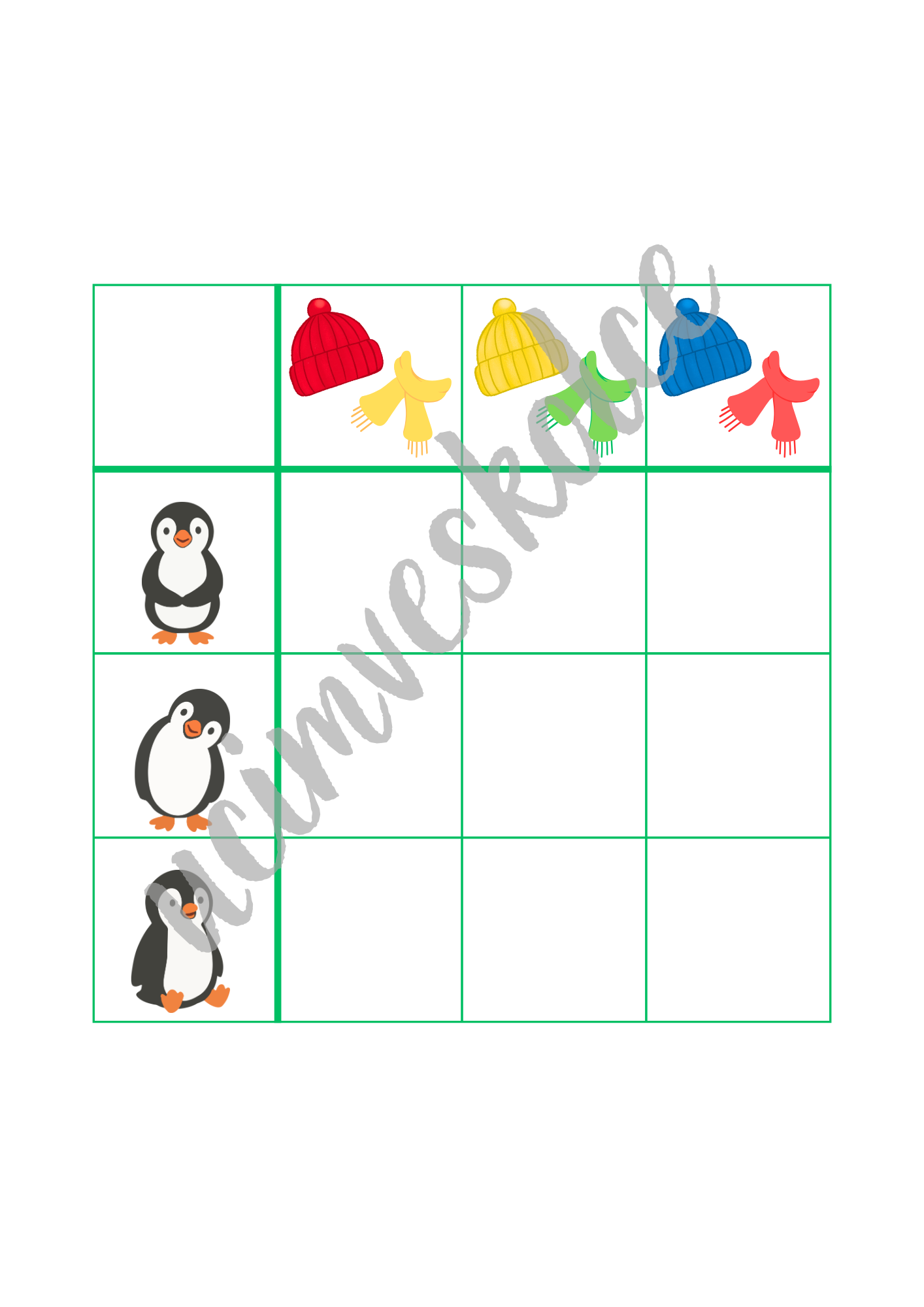 - v horním řádku každé tabulky jsou obrázky různých čepic a šál