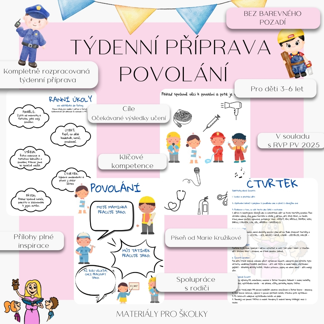 Všechny materiály jsou připraveny k okamžitému použití. Tato příprava poskytuje učitelům komplexní nástroj, jak děti seznámit s různými povoláními a připravit je na objevování světa kolem nich.