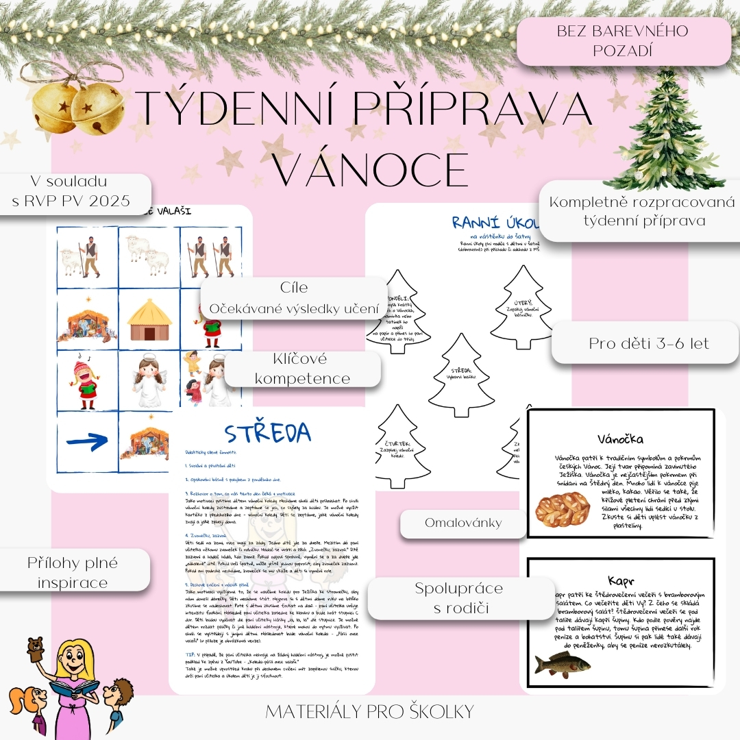 Připravte se na kouzelné období Vánoc s materiálem „Vánoce“, určeným pro učitele mateřských škol. Tento komplexní soubor aktivit přibližuje dětem vánoční tradice prostřednictvím smyslových, pohybových a tvořivých činností. Učitelé zde naleznou podrobný týdenní plán, který zahrnuje rozvíjení jemné i hrubé motoriky prostřednictvím tvořivých aktivit, podporu smyslového vnímání a poznávání vánočních tradic. Součástí jsou také podněty k rozvoji komunikačních dovedností dětí formou příběhů a říkanek, a tvořivé činnosti, jako je výroba adventních věnců, ozdob a dalších dekorací. Dále obsahuje cíle, očekávané výstupy, klíčové kompetence.