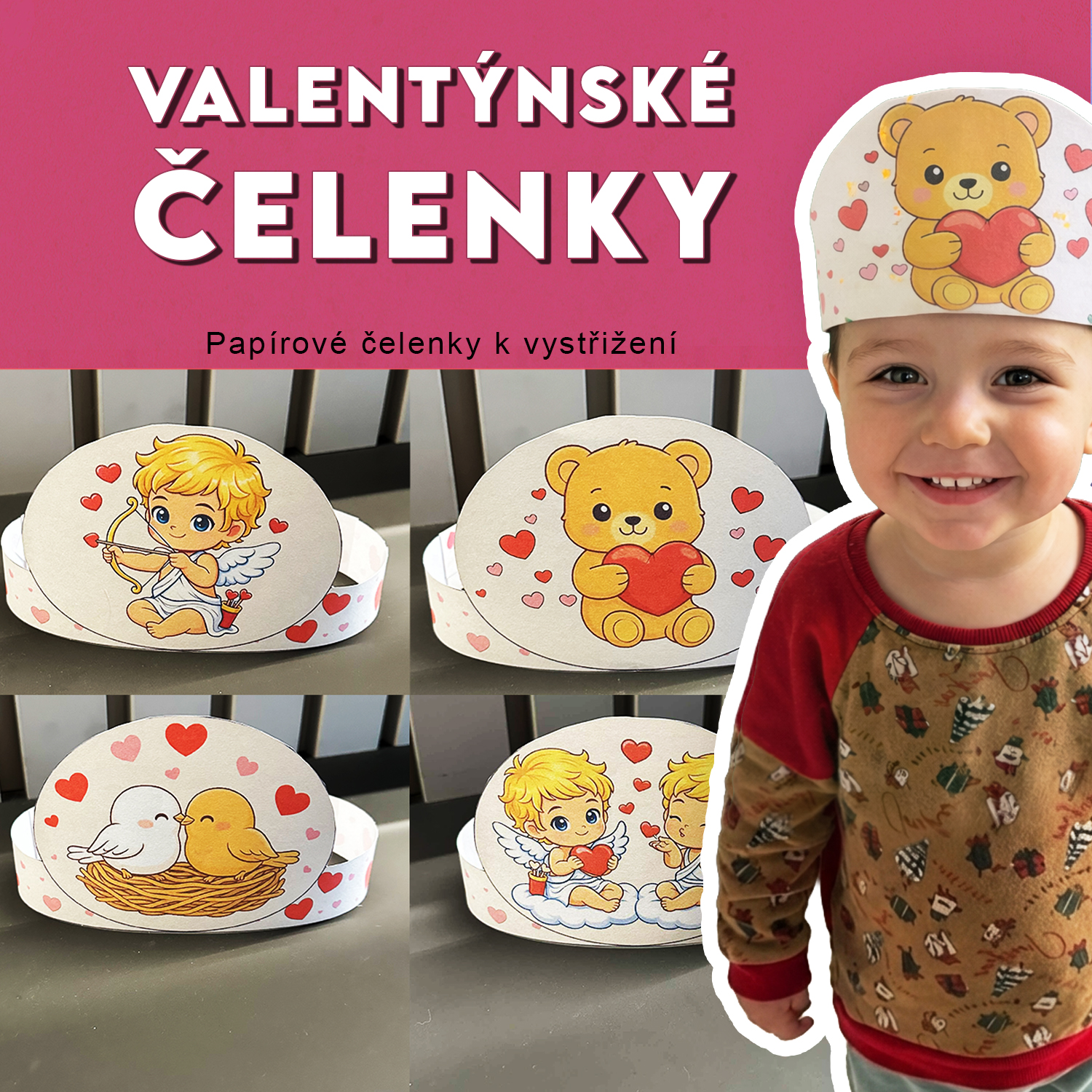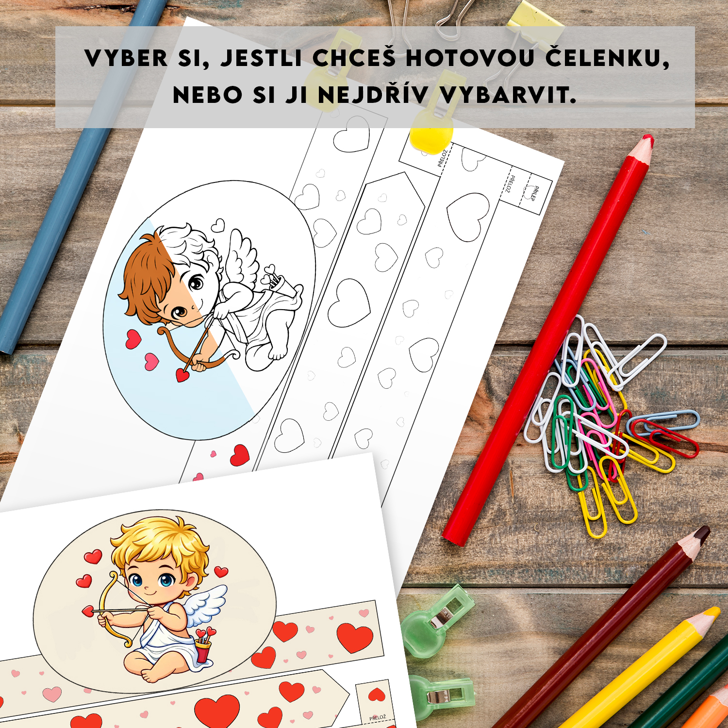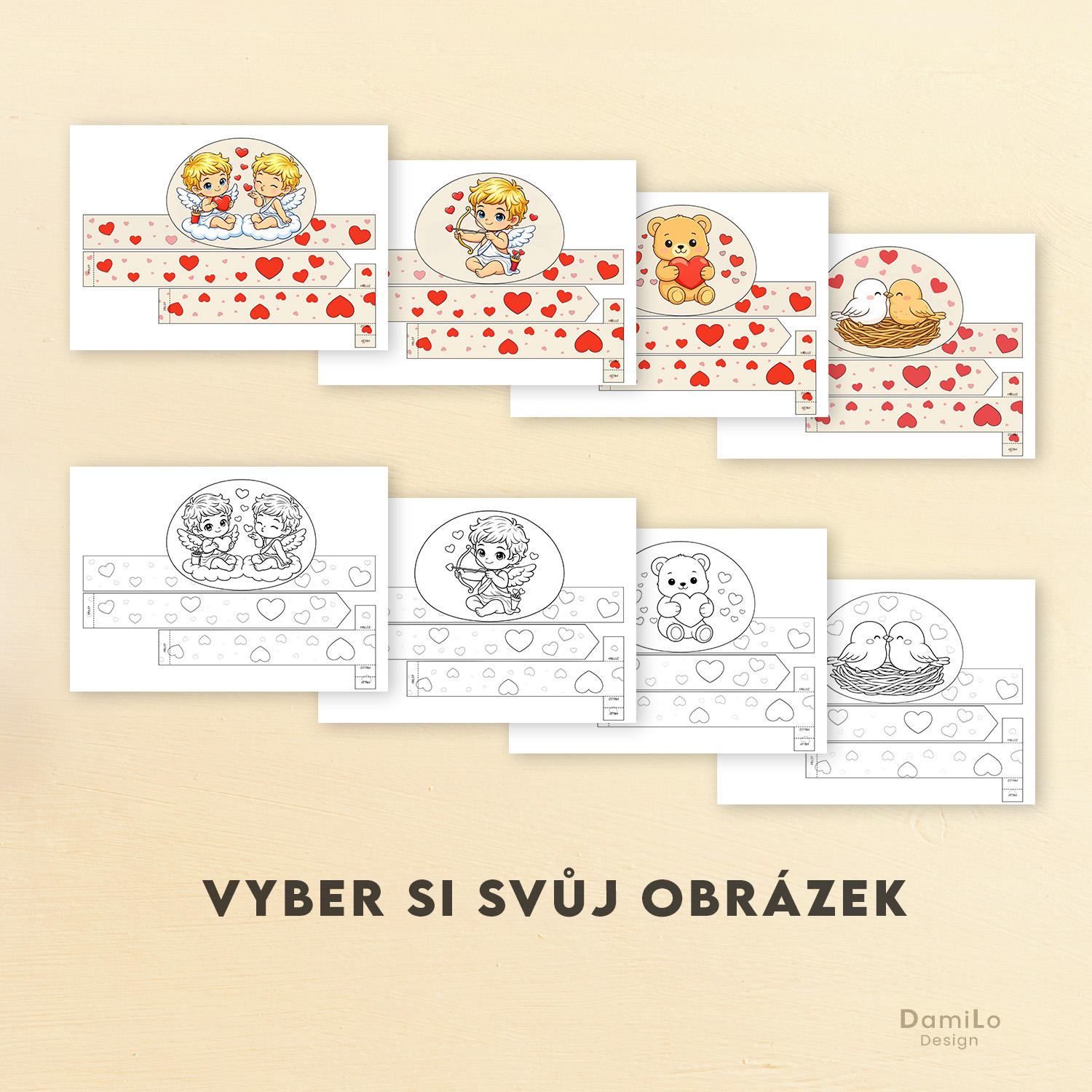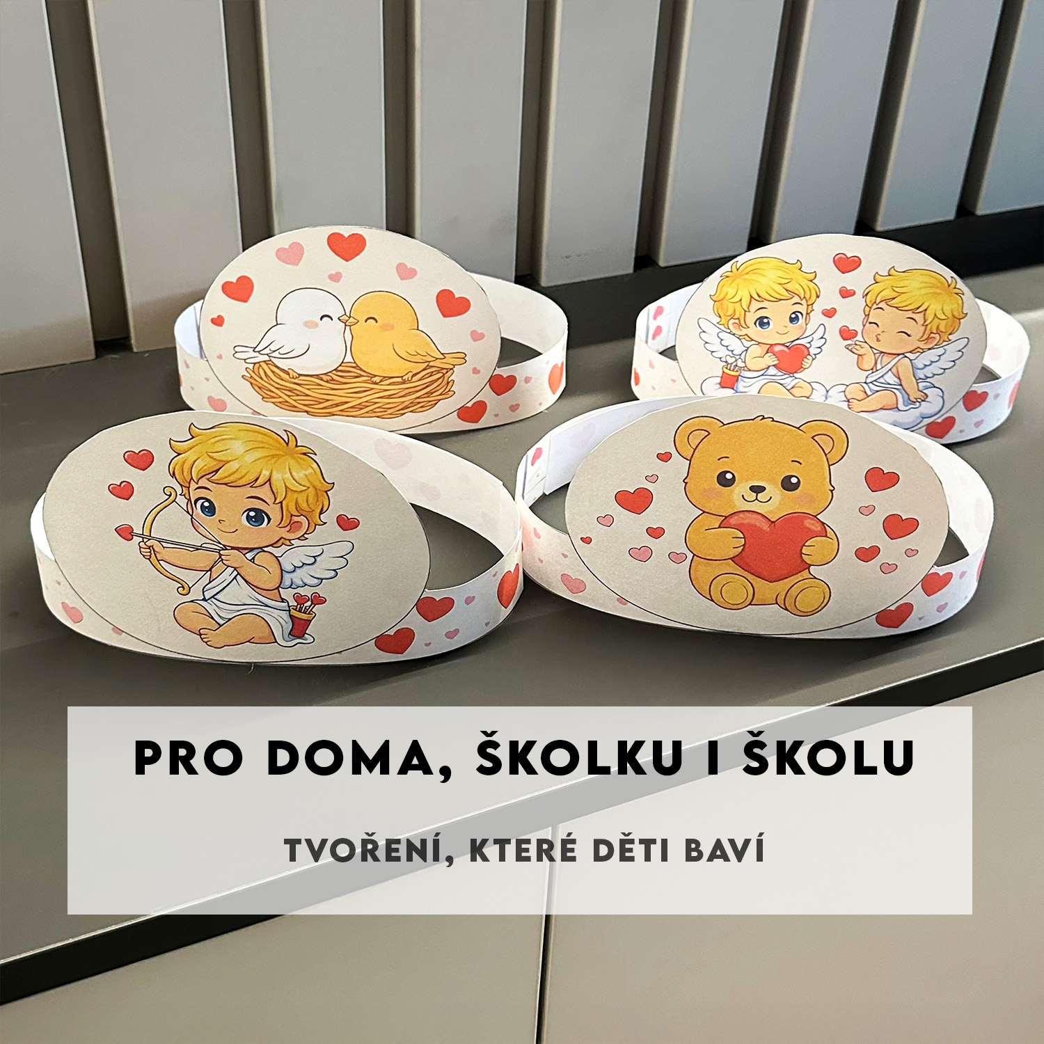 (medvídek se srdíčkem, zamilovaní ptáčci v hnízdě, dvojice andělíčků, andělíček s lukem a šípem) - 4 černobílé verze čelenek určené k vybarvení