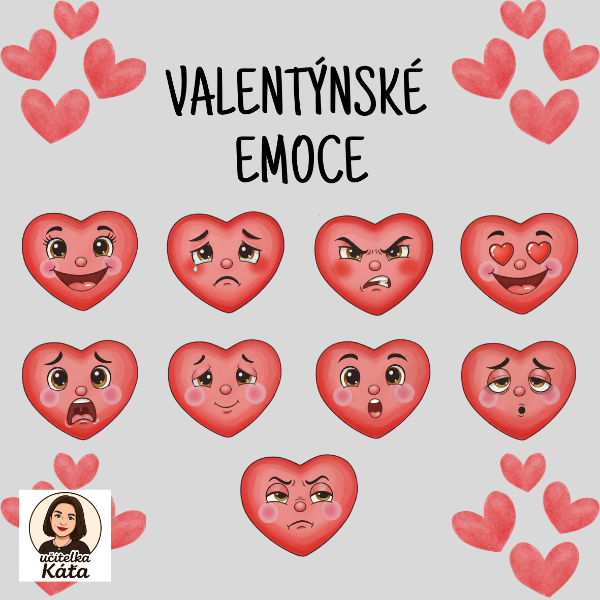 Sada obrázků srdíček s různými obličejovými výrazy, které znázorňují základní emoce (radost, smutek, hněv, zamilovanost, strach, stydlivost, překvapení, vyčerpání, uraženost ). Materiál je určen pro děti v mateřské škole a pomáhá jim hravou formou rozpoznávat a pojmenovávat pocity, rozvíjet emoční inteligenci a komunikaci. Lze s nimi hrát i různé hry v komunitním kruhu.