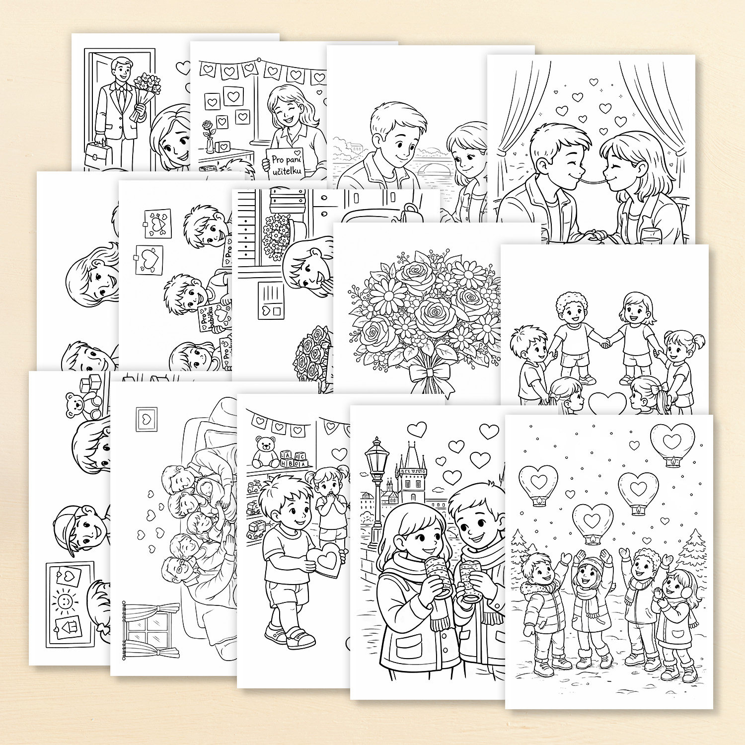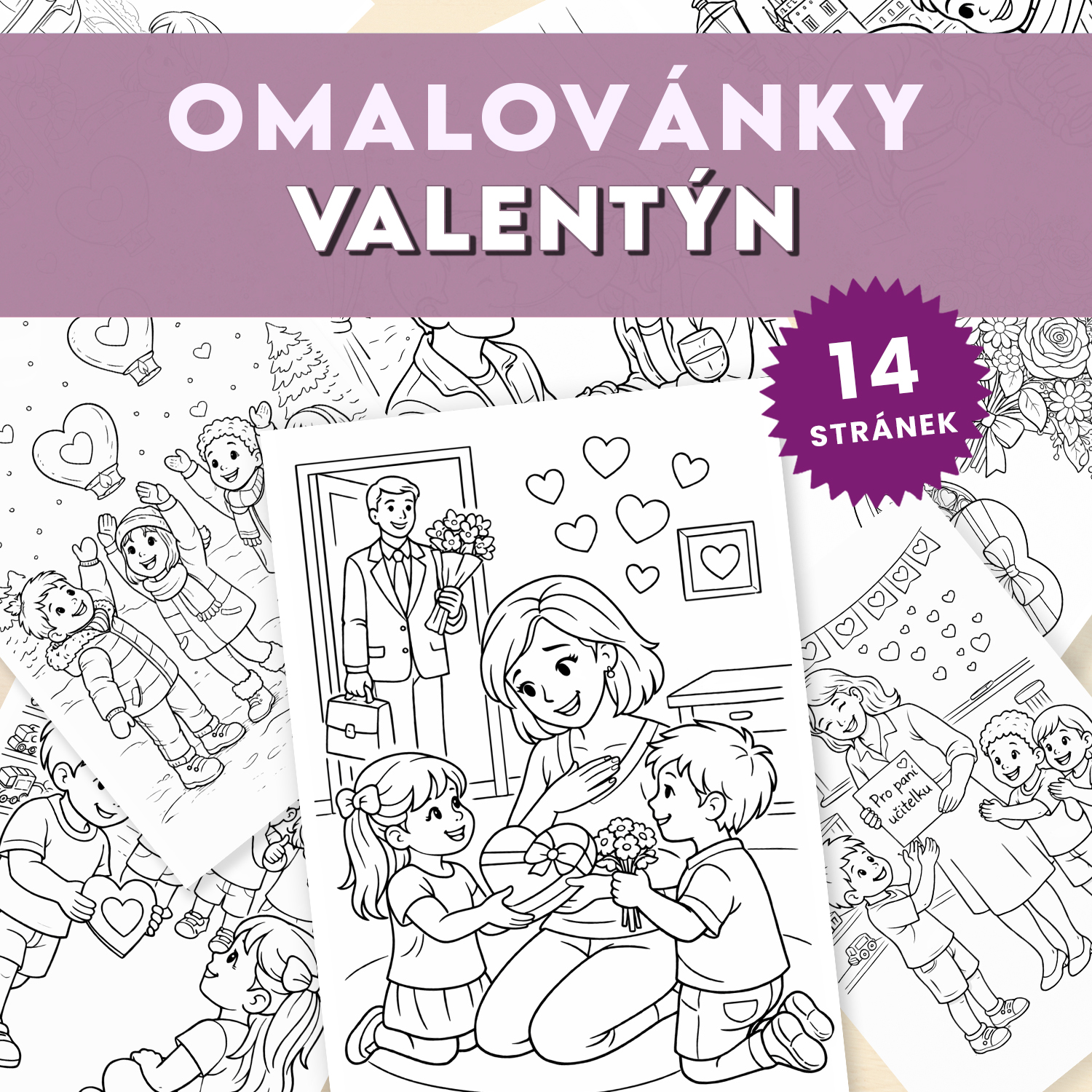 Sada 14 omalovánek s valentýnskou tematikou.