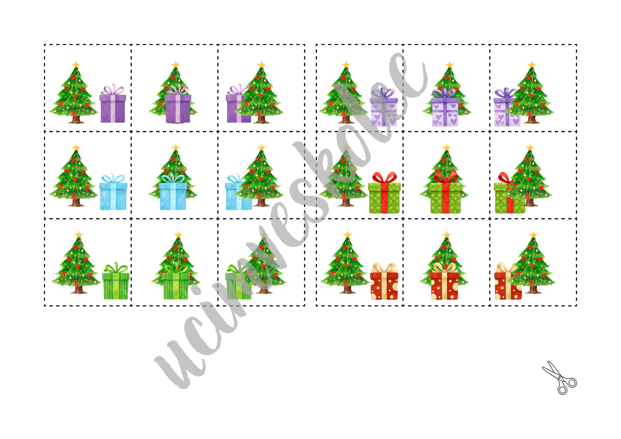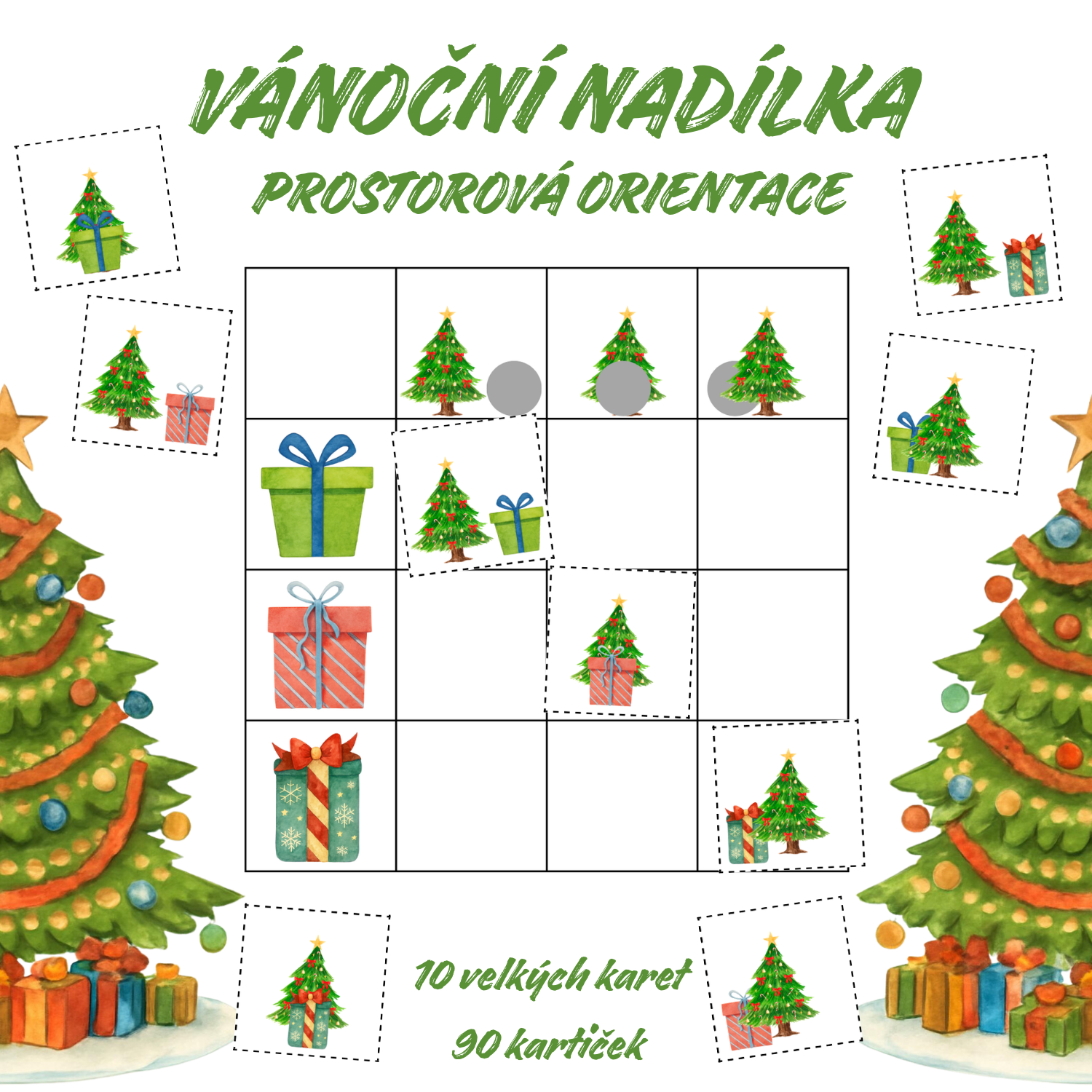 Děti mají za úkol najít a přiložit na správné místo v tabulce kartičku s obrázkem dárečku a stromečku (dáreček může být vedle stromečku, před stromečkem nebo za stromečkem).