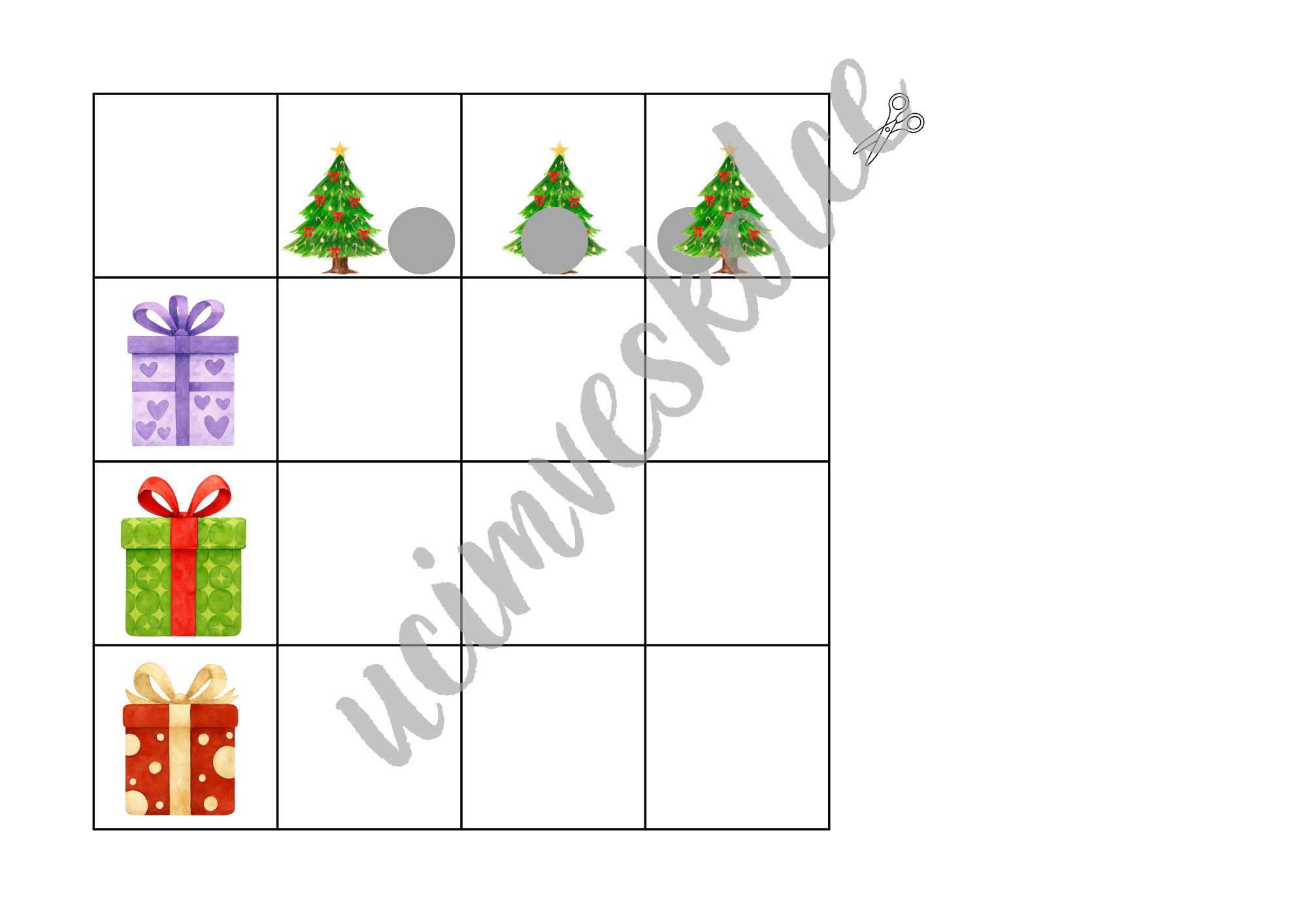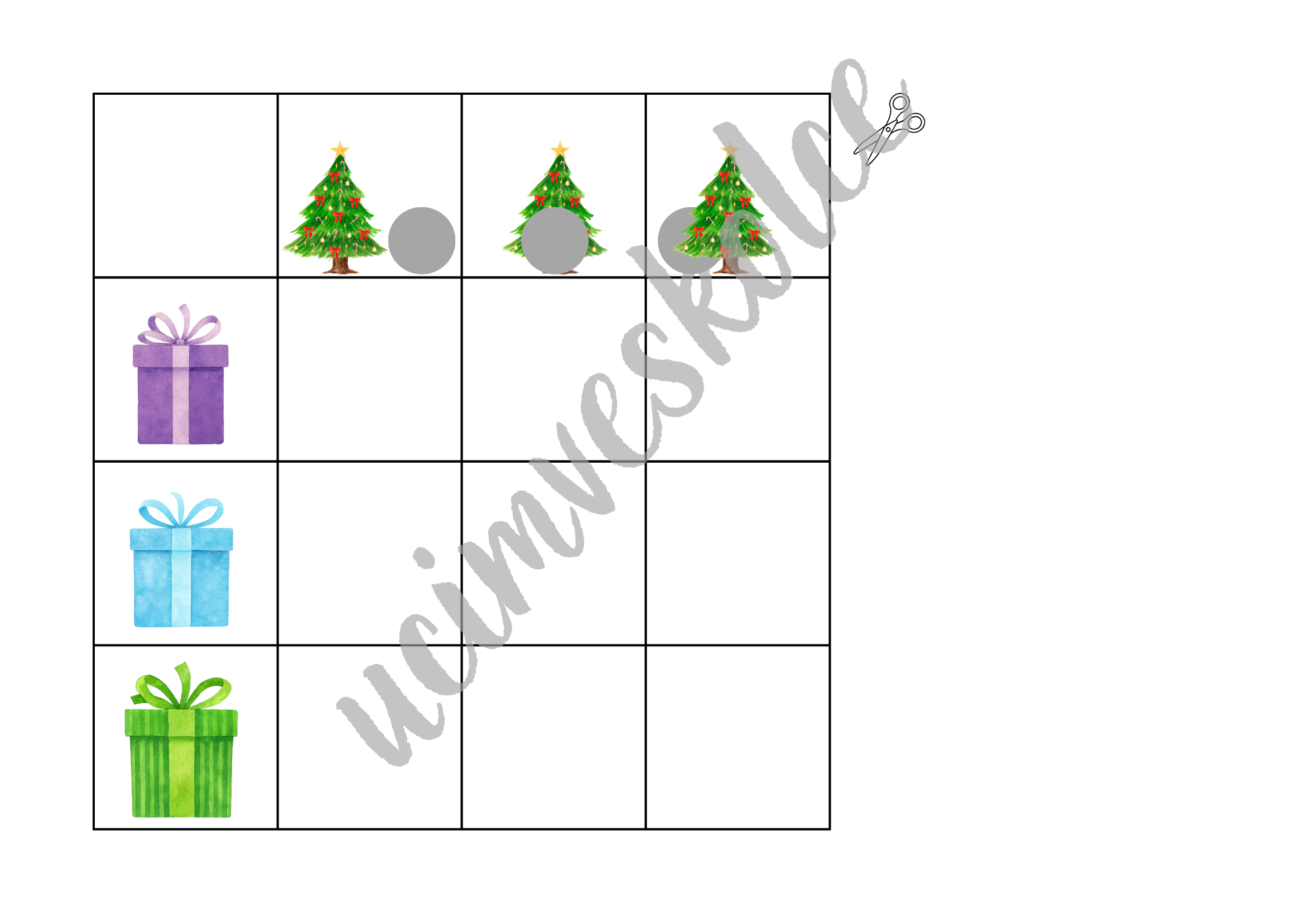 V levém sloupci každé velké tabulky jsou obrázky různých dárečků. V horním řádku tabulky jsou obrázky vánočních stromečků a šedých kruhů, které jsou VEDLE stromečku, PŘED stromečkem nebo ZA stromečkem.
