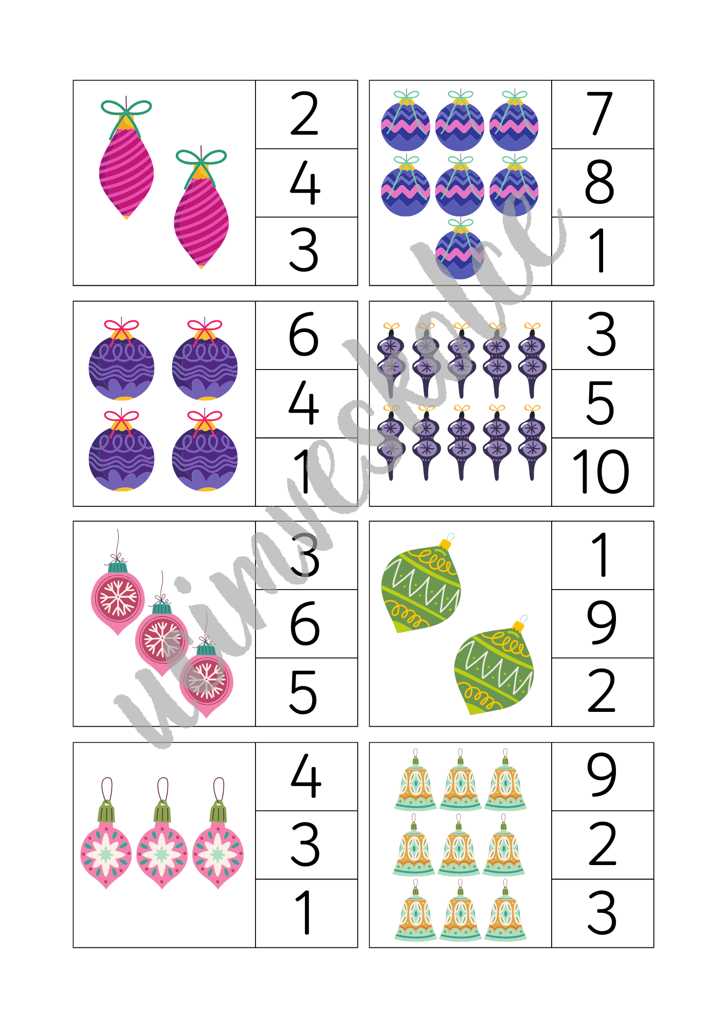 Cílem této aktivity je spočítat prvky na kartičce a připnout kolíček na políčko se správným číslem (32 kartiček) nebo na políčko se shodným počtem puntíků na obrázku hrací kostky (32 kartiček).