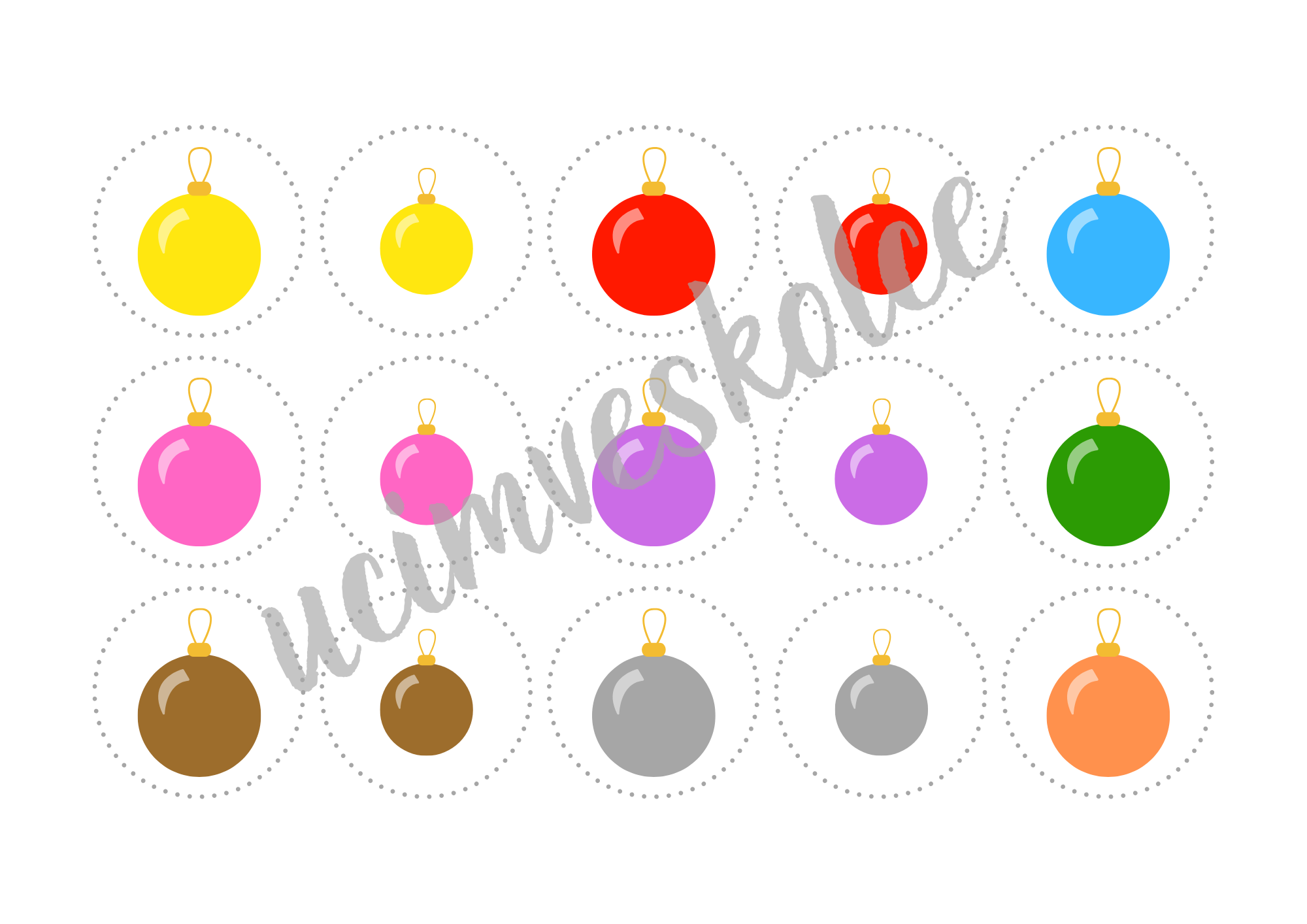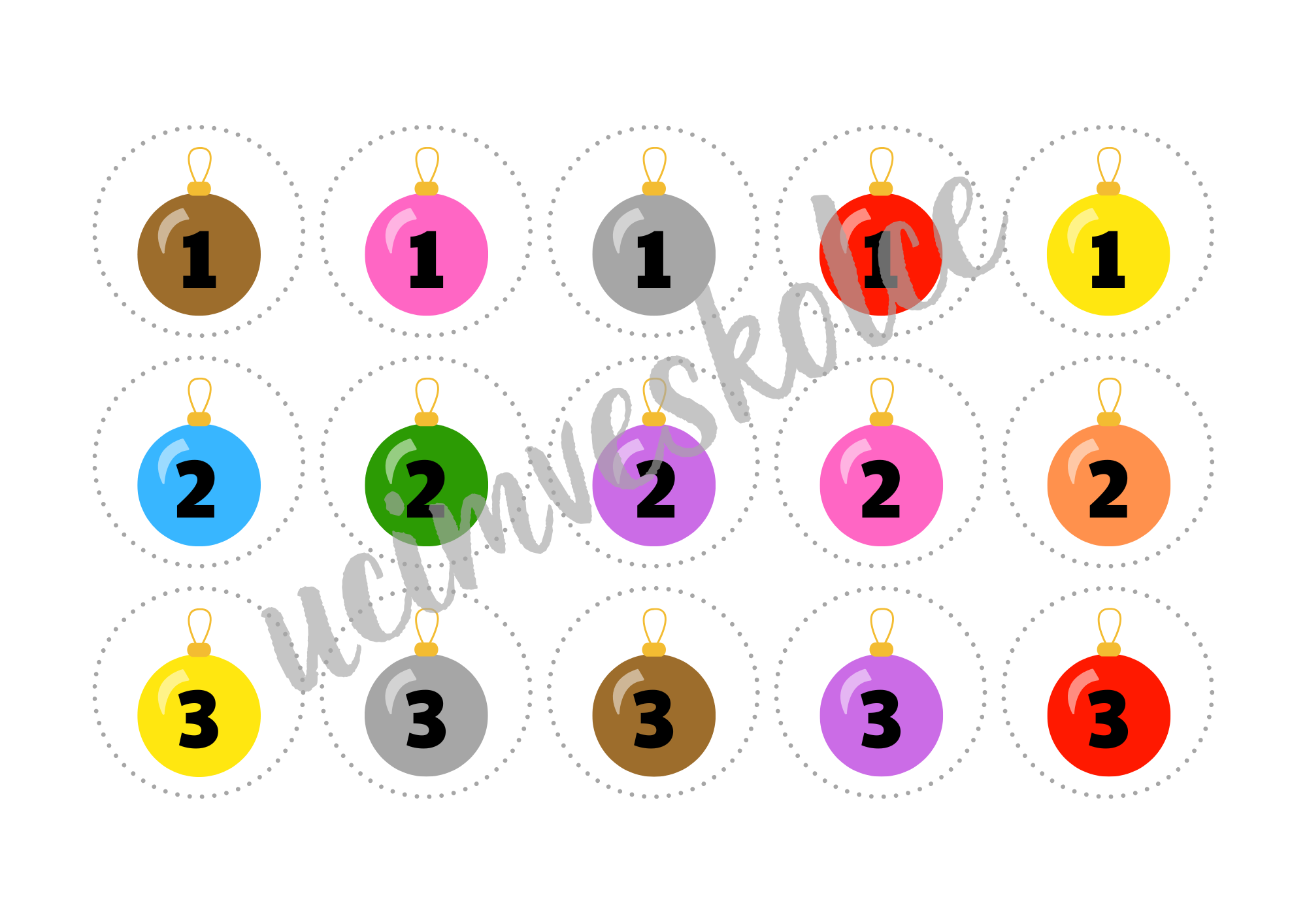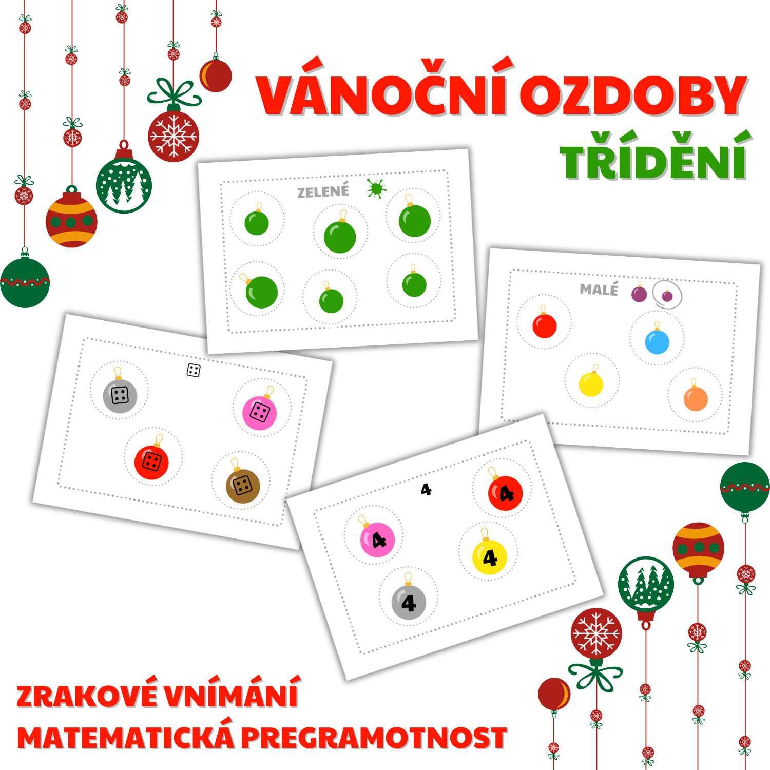 V souboru najdete 23 velkých karet, v jejichž horní části je vždy zadání kritéria, podle kterého se třídí malé kruhové kartičky s obrázky vánočních ozdob (celkem 120 kartiček).