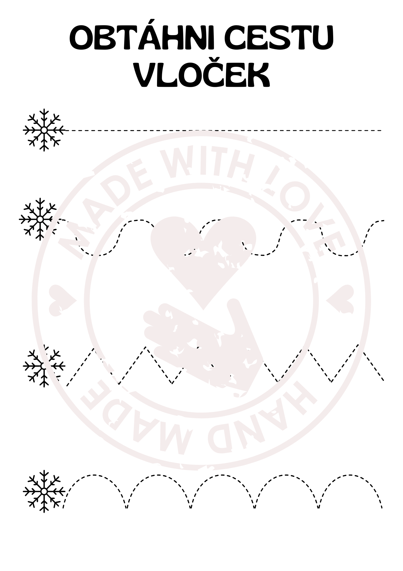 Úkoly podporují správné držení tužky, plynulost pohybu ruky a přípravu na psaní. Děti se snaží obtáhnout cesty vloček co nejpřesněji.