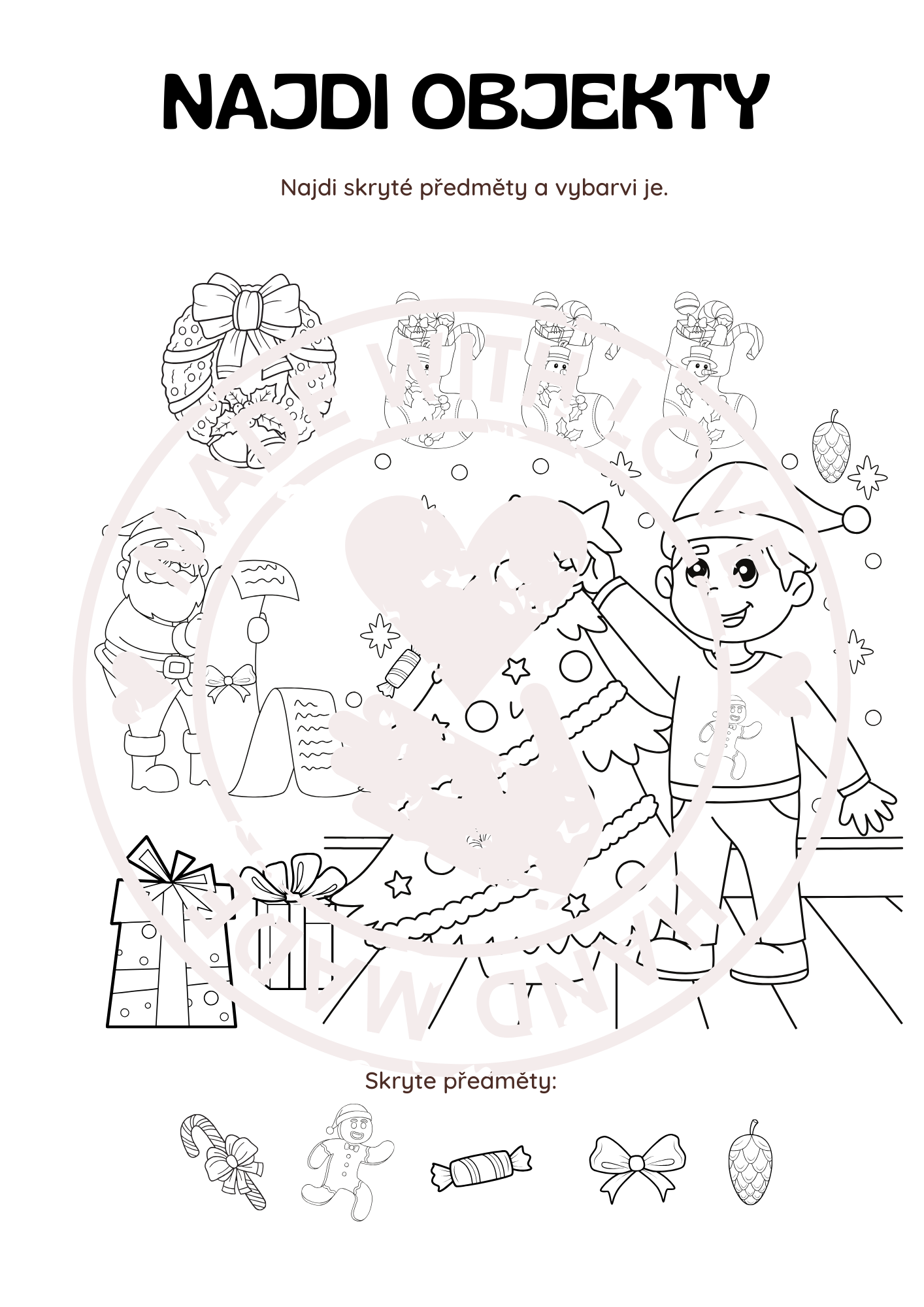 Úkol zaměřený na koncentraci, trpělivost a rozlišování drobných tvarů. Děti vyhledávají schované objekty na obrázku a vybarvují je.